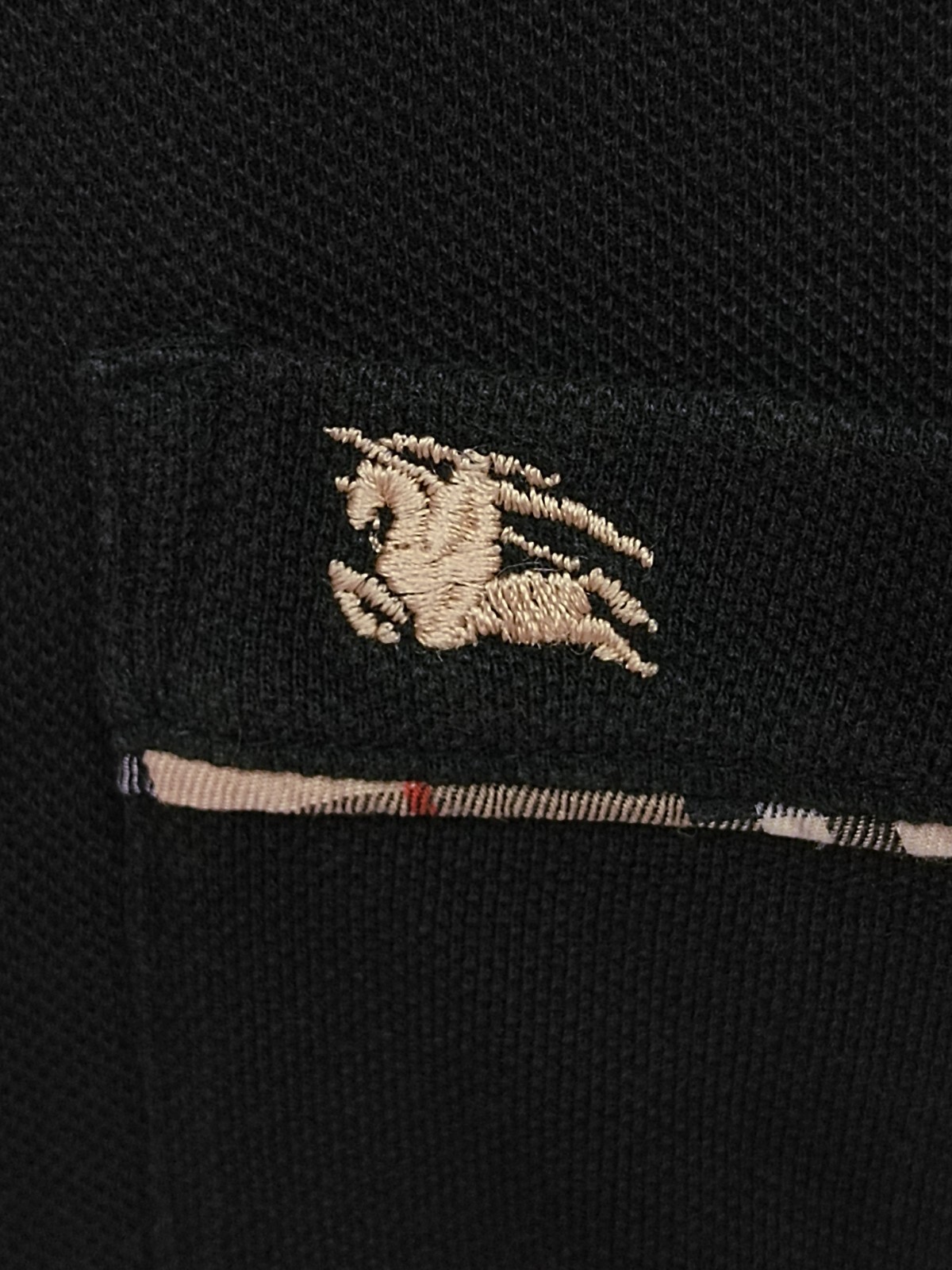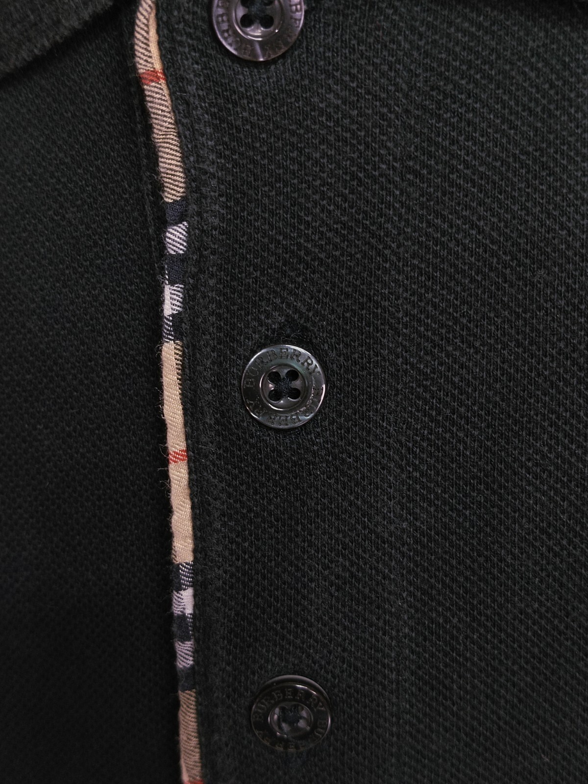 Cool Burberry London trim nova check solid black pique cotton men's polo shirt short sleeves with button front authenticity guaranteed. The shirt has polo collar, single chest pocket embroidered with logo on left, 3 emboss buttons closure on front, The color is black with solid pattern. Fabric is 100% pique cotton. Straight hem slit at side. The shirt is pre-owned still in good condition there is a stain around front chest of the shirt. Please see the photos. It has been laundered clean and fresh ready to wear. Don't miss out cool and awesome polo shirt.