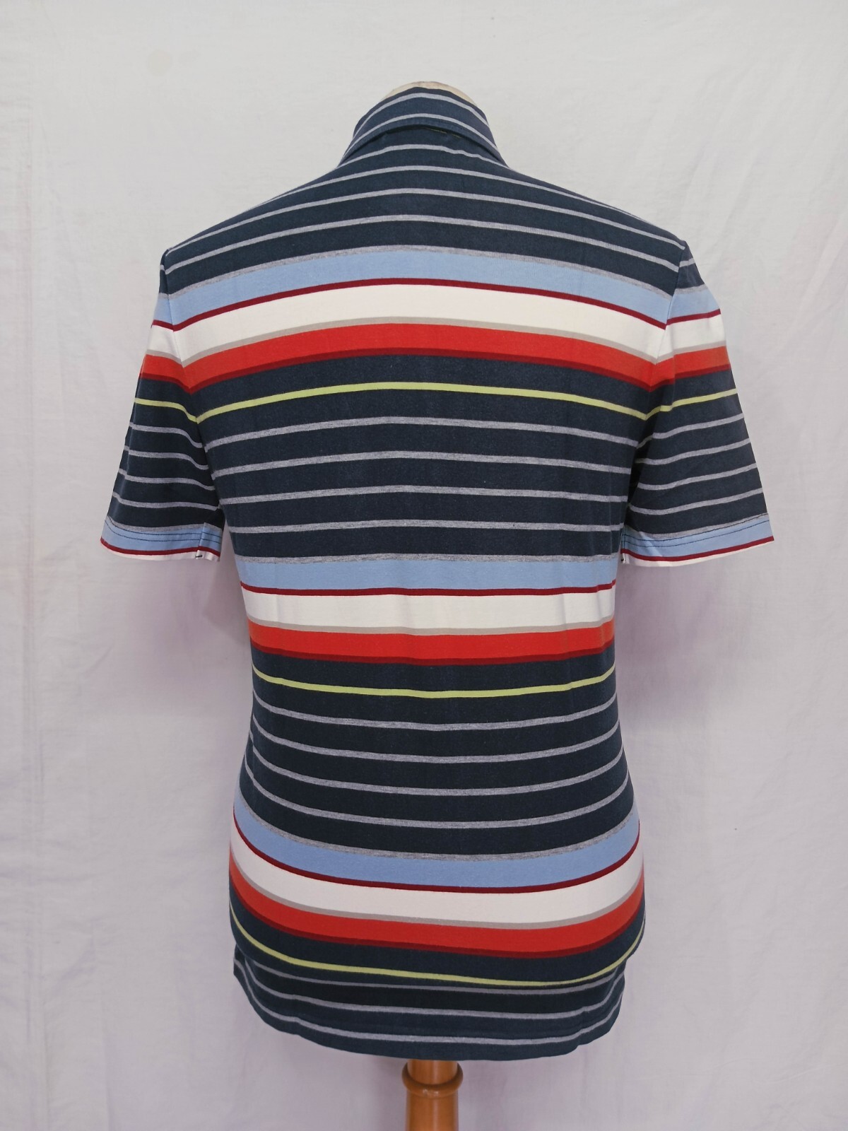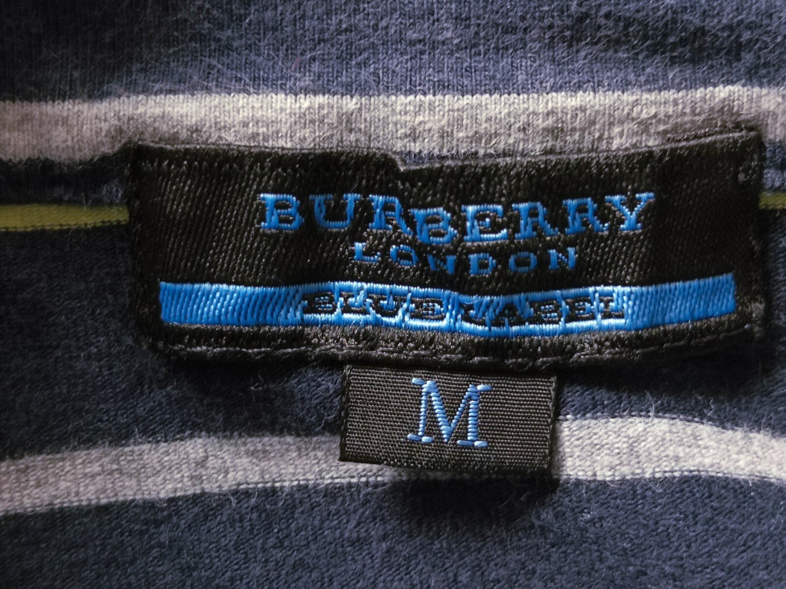 Awesome Burberry London Blue Label multicolor striped men's polo shirt short sleeves with button front authenticity guaranteed. The shirt has polo collar, single chest pocket embriodered with logo on left, 5 snap buttons closure on front, The color is dark blue, gray, light blue, white, red, orange, pastel yellow with striped pattern. Fabric is 100% cotton. The shirt is pre-owned still in excellent condition no holes, tears, stains. It has been laundered clean and fresh ready to wear. Don't miss out cool and awesome polo shirt.