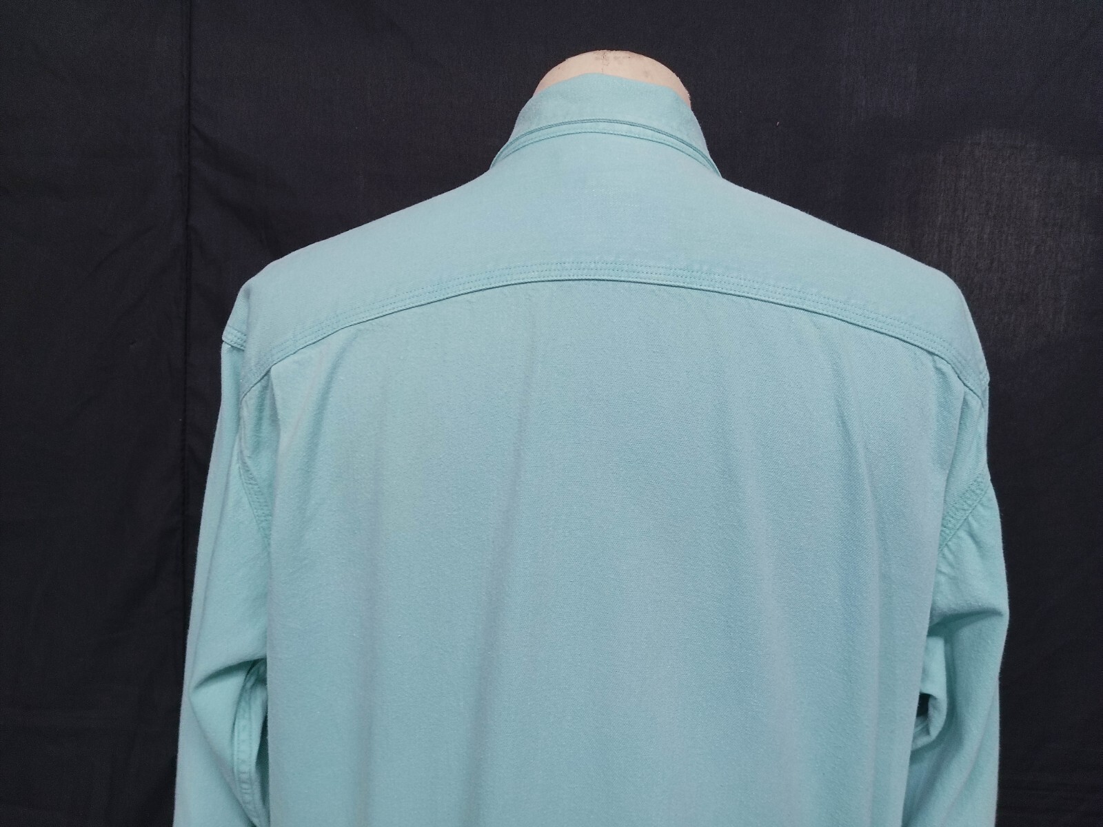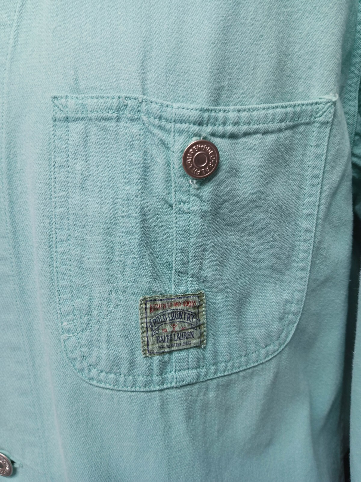 Cool vintage Polo Country Ralph Lauren aqua blue canvas denim men's work shirt. Check out cool & awesome vintage shirt long sleeves with buttons front authenticity guaranteed. The shirt has point collar, double chest pocket on front with 5 metal buttons closure on front. The color is aqua blue solid pattern. Fabric is 100% cotton. The shirt is pre-owned still in excellent condition, there are no holes, tears, stains. It has been laundered clean and fresh ready to wear. Don't miss out cool and awesome vintage shirt.
