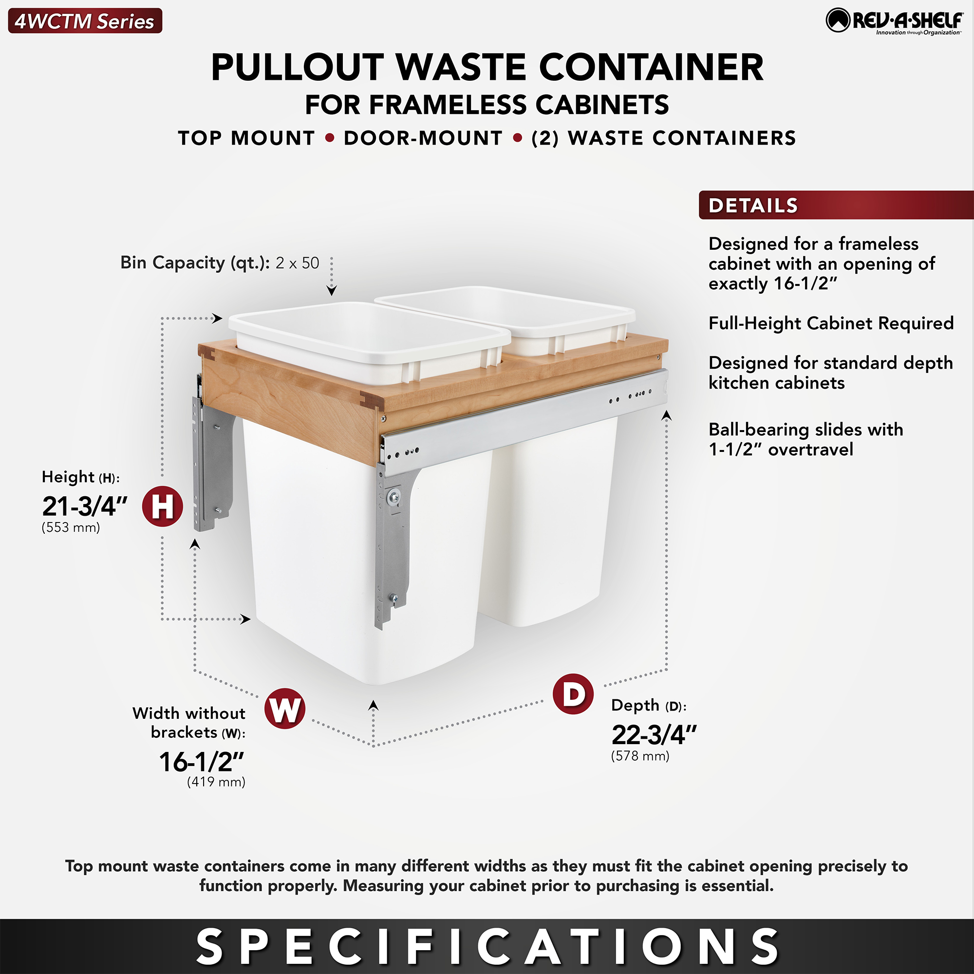 Only one pullout trash container series has stood the test of time and that is Rev-A-Shelf® Top Mount Series Waste Containers. The Top Mount series features beautiful fully assembled dovetail wood construction and full-extension slides for total access and easy removal of your trash bins. All the top mount series also includes a 4-way adjustable door mount bracket that will finish off your installation by attaching your own cabinet door for easy operation. It’s available in various widths, depths and heights for your specific cabinet application.