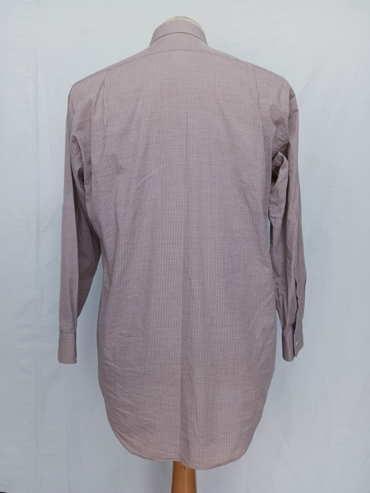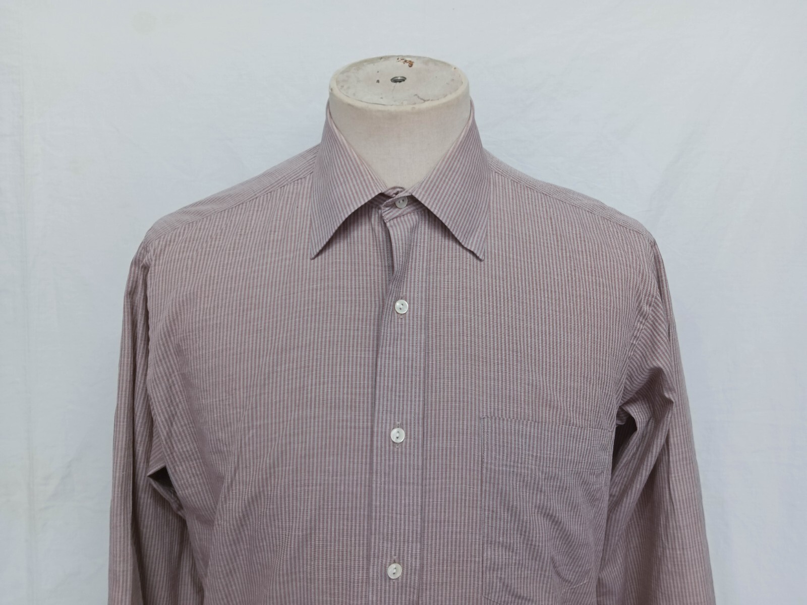 Luxury vintage ISSEY MIYAKE Design Studio brown & gray striped men's dress shirt long sleeves with covertible cuff buttons front authenticity guaranteed. The shirt has point collar, single chest pocket on left with 7 buttons closure on front. The color is brown, gray with striped pattern. Fabric is 85% cotton, 15% polyester. The shirt is pre-owned still in excellent condition no holes, tears, stains. It has been laundered clean and fresh ready to wear. Don't miss out gorgeous and awesome deisgner dress shirt.
