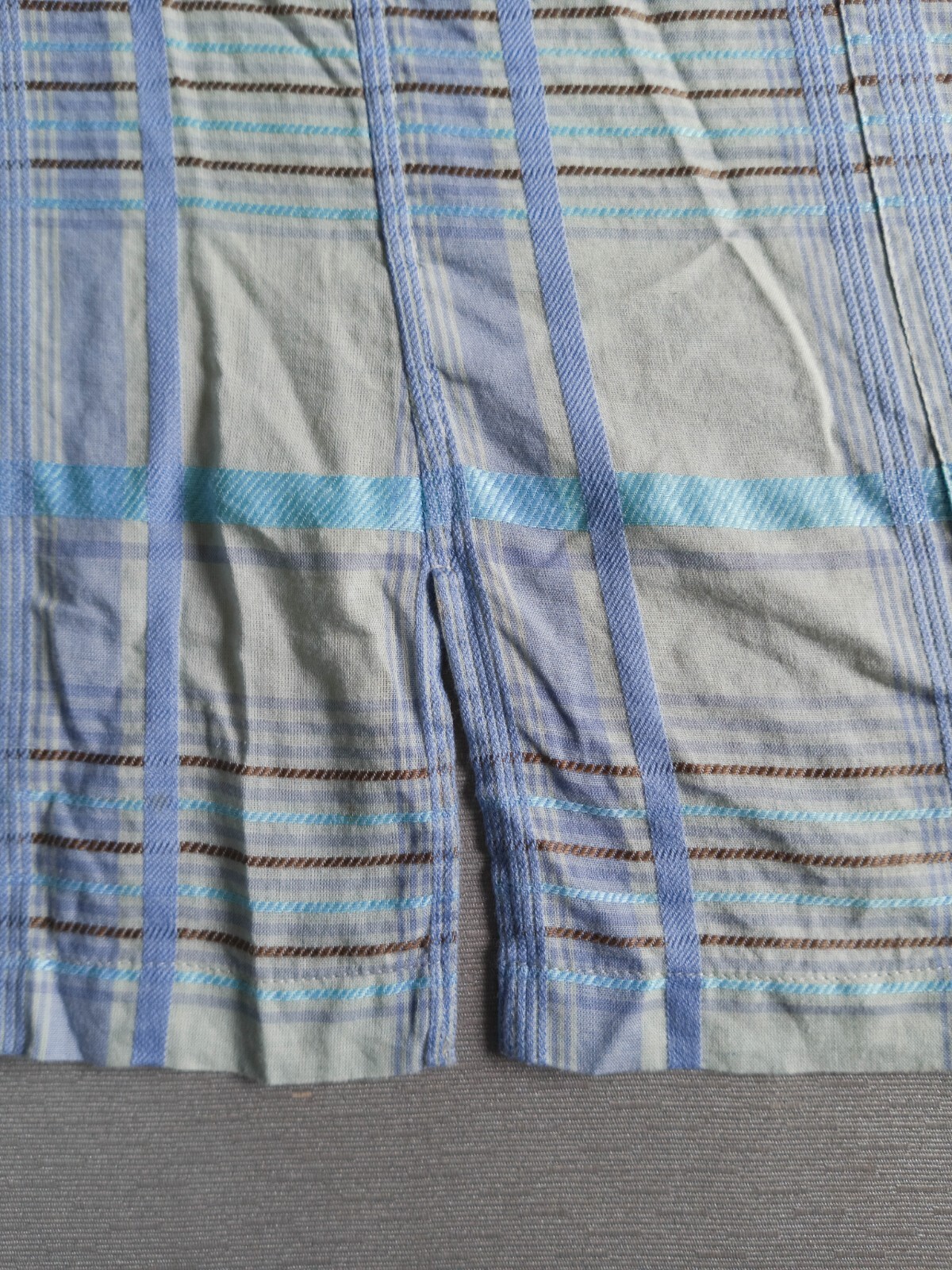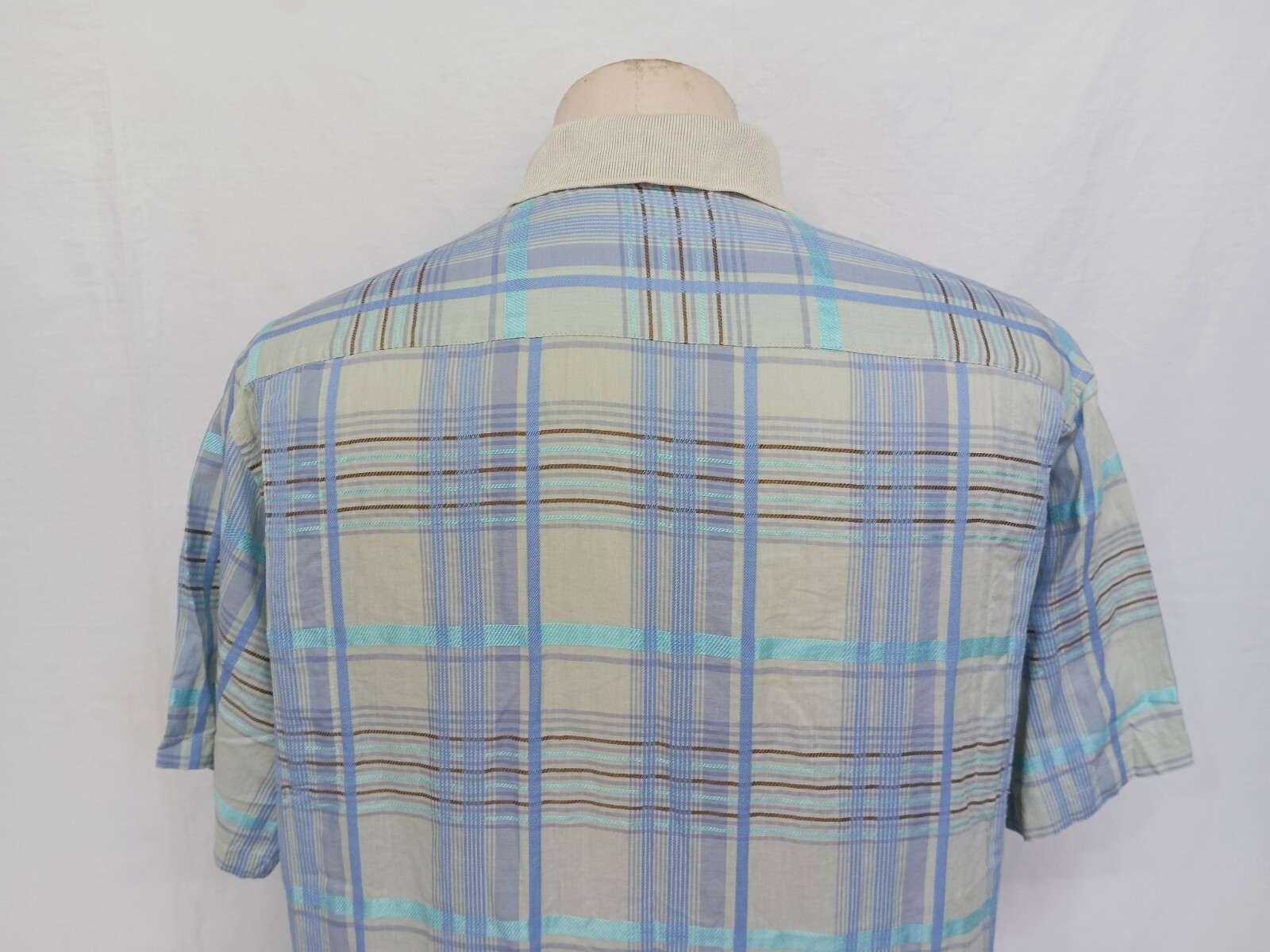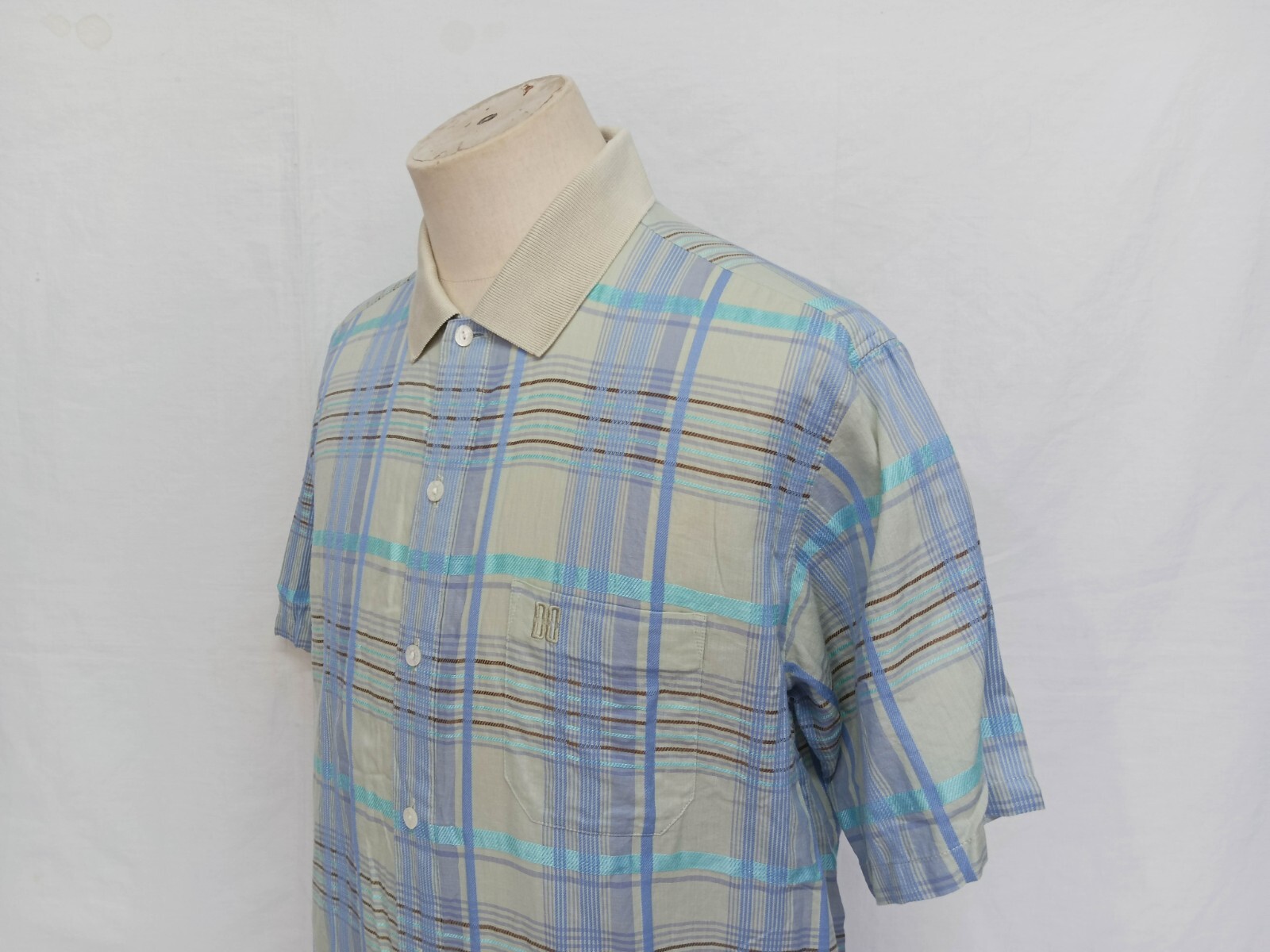 Awesome DAKS light gray, cyan blue, brown, aqua blue check men's casual shirt authenticity guaranteed. Check out awesome vintage designer shirt short sleeves with buttons front. The shirt has point collar, single chest pocket with embroidered logo on left. 7 emboss mother of pear buttons closure on front. The color is light gray, cyan blue, brown, aqua blue with plaid pattern. Fabric is 80% cotton, 20% linen. The shirt is pre-owned still in excellent condition. It has been laundered clean and fresh ready to wear. Don't miss out cool and awesome designer shirt.