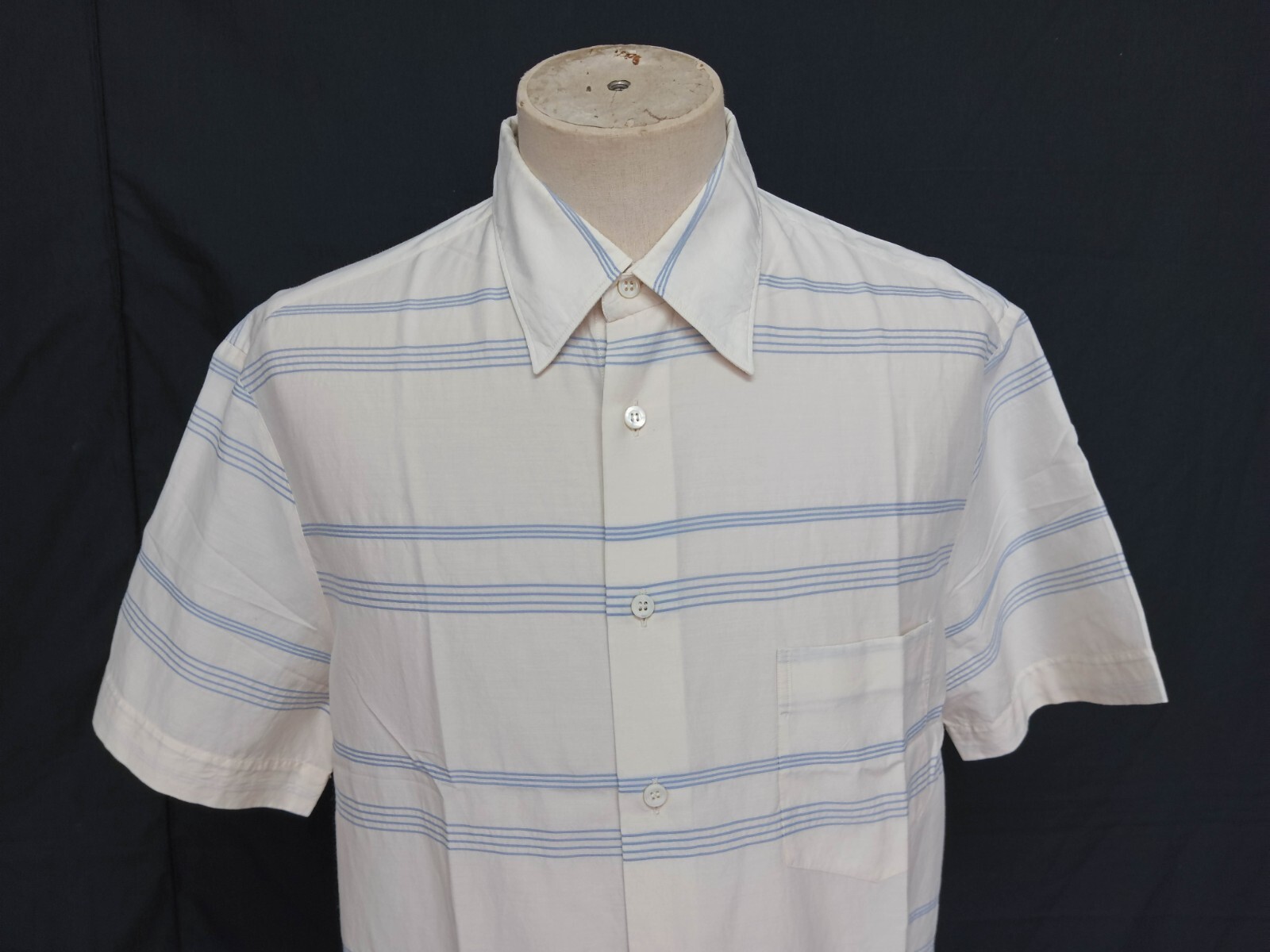 Awesome Armani Collezioni ivory & light blue striped men's casual shirt short sleeve with buttons front authenticity guaranteed. Check out awesome designer shirt. The shirt has point collar, single chest pocket on left with 7 buttons closure on front. The color is ivory, light blue with striped pattern. Fabric is 70% cotton, 30% cupro. The shirt is pre-owned still in excellent condition no holes, tears, stains. It has been laundered clean and fresh ready to wear. Don't miss out cool and awesome designer shirt.