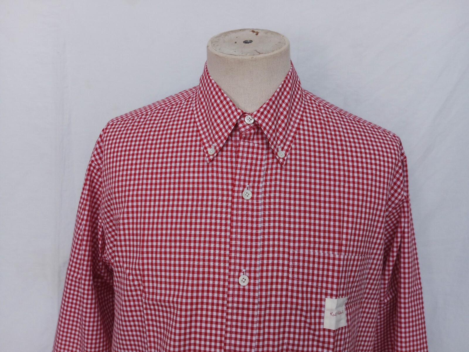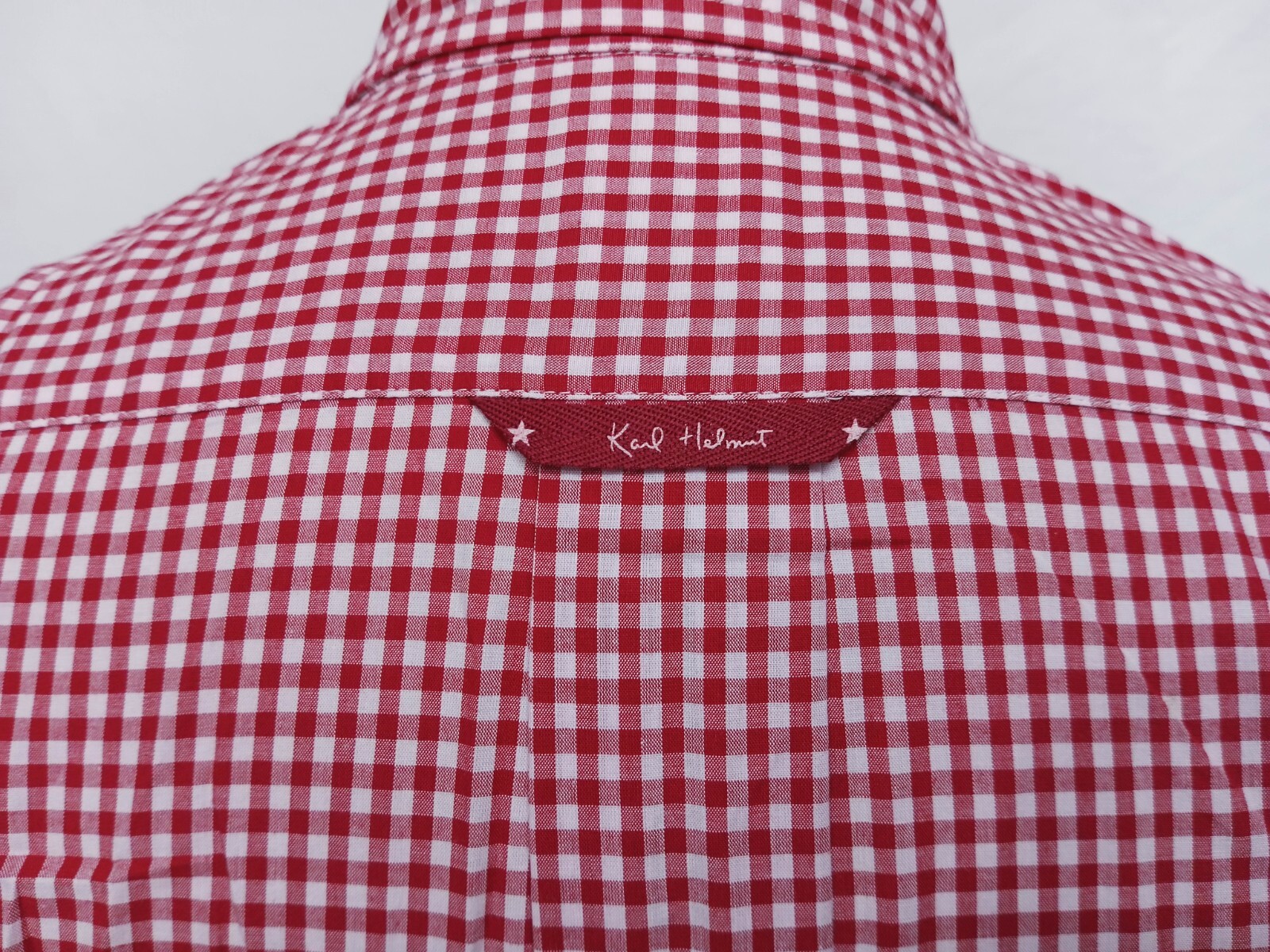 Awesome Karl Helmut red & white check men's casual shirt long sleeve with buttons front authenticity guaranteed. The shirt has button-down collar, single chest pocket with patch logo on left, 7 emboss buttons closure on front. The color is red, white with gingham pattern. Fabric is 100% cotton. The shirt is pre-owned still in excellent condition, no holes, tears, stains. It has been laundered clean and fresh ready to wear. Don't miss out cool and awesome shirt.