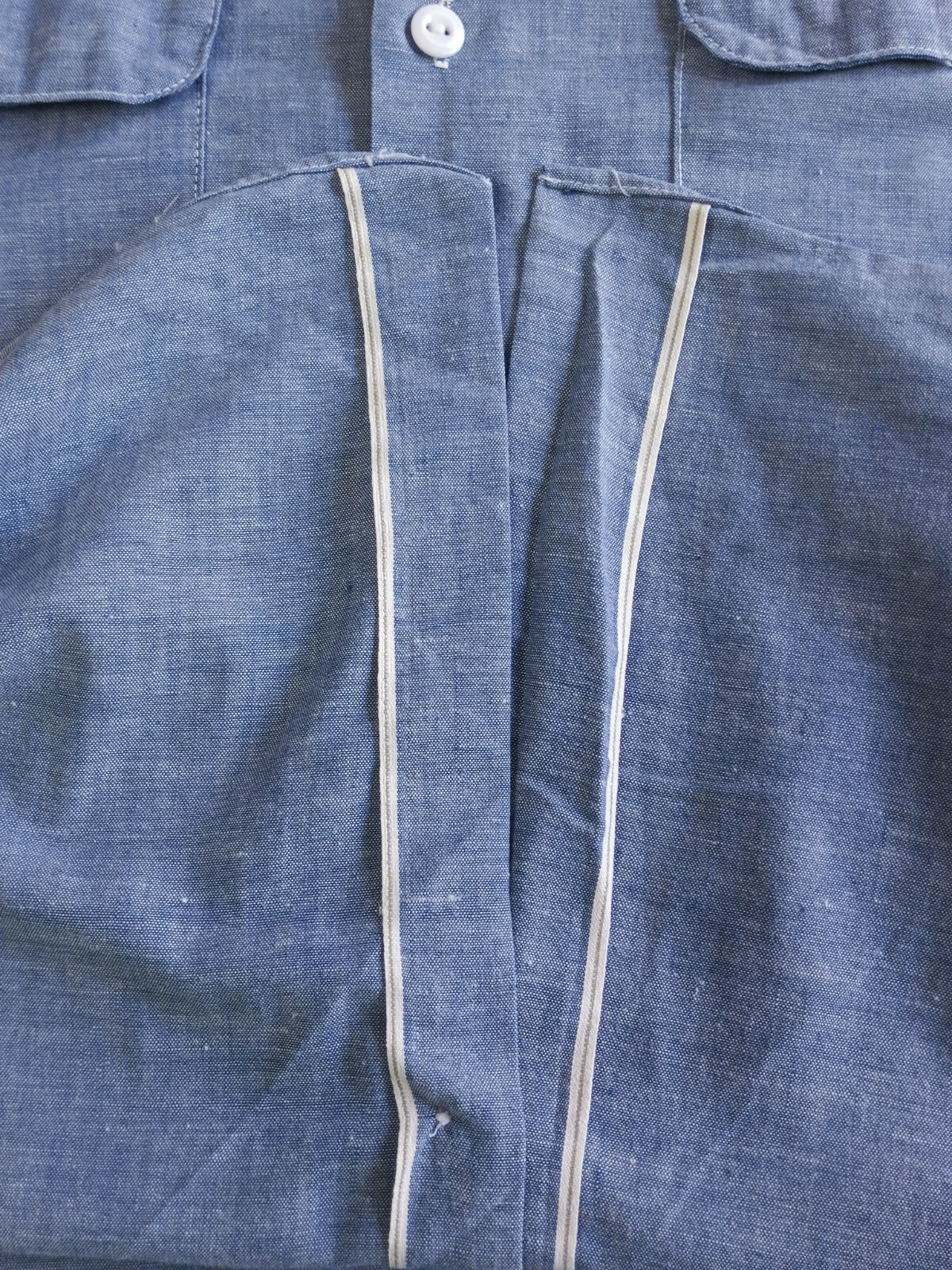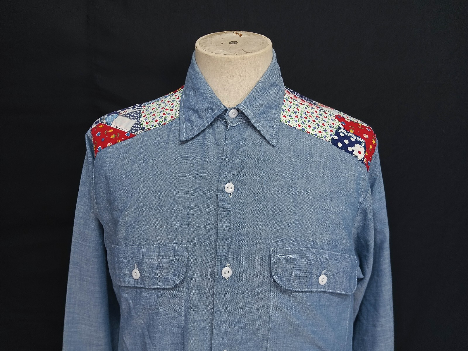 Awesome vintage 70's BIG MAC by JCPenny chambray men's work shirt authenticity guaranteed. Check out awesome vintage shirt long sleeves with buttons front. The shirt has point collar, double chest button pocket with flap on front, 6 buttons closure on front. The color is sky blue with patch on yoke and cuff. Fabric is chambray 50% cotton, 50% polyester, selvedge fabric. The shirt is pre-owned still in good vintage condition no holes, tears, stains. It has been laundered clean and fresh ready to wear. Don't miss out cool and awesome vintage shirt.