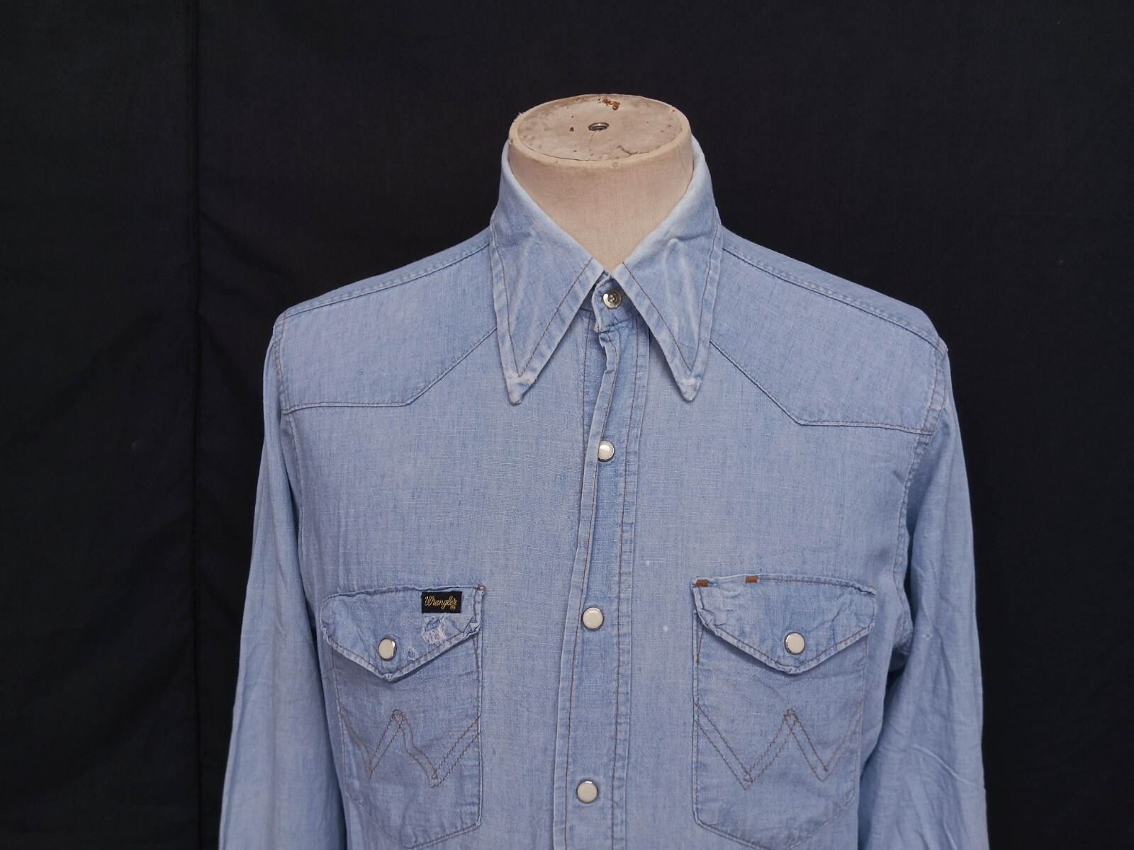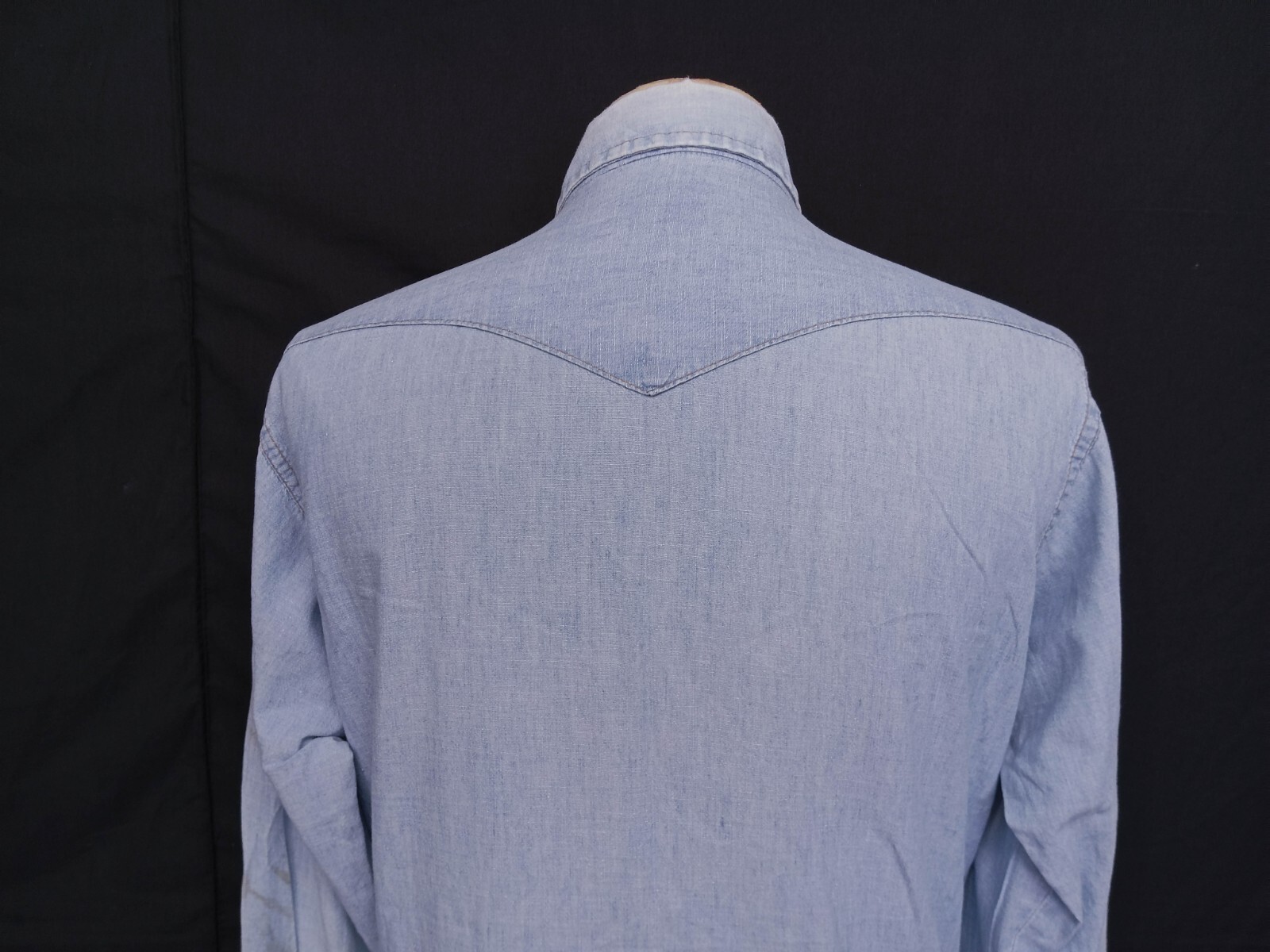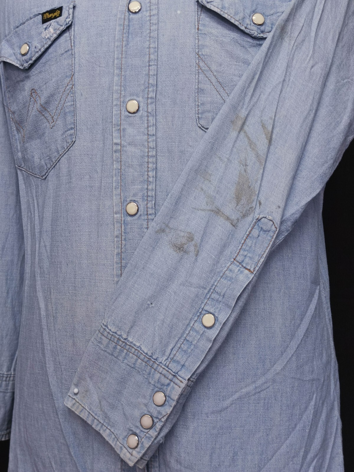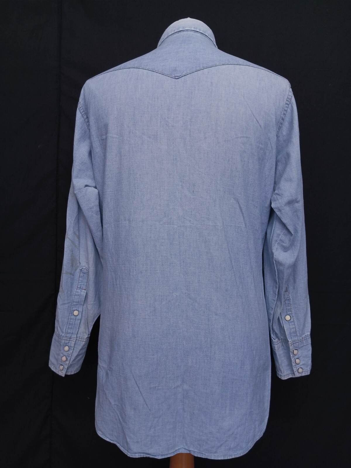 Awesome vintage 70's Wrangler chambray pearl snap men's western shirt long sleeves with snaps closure authenticity guaranteed. The shirt has point collar, double flap chest snap pockets with 7 pearl snap buttons closure on front. The color is sky blue with solid pattern. Fabric is 100% cotton chambray. The shirt is pre-owned still in good vintage condition holes, stains on the shirt. Please see the photos. It has been laundered clean and fresh ready to wear. Don't miss out cool and awesome vintage western shirt.