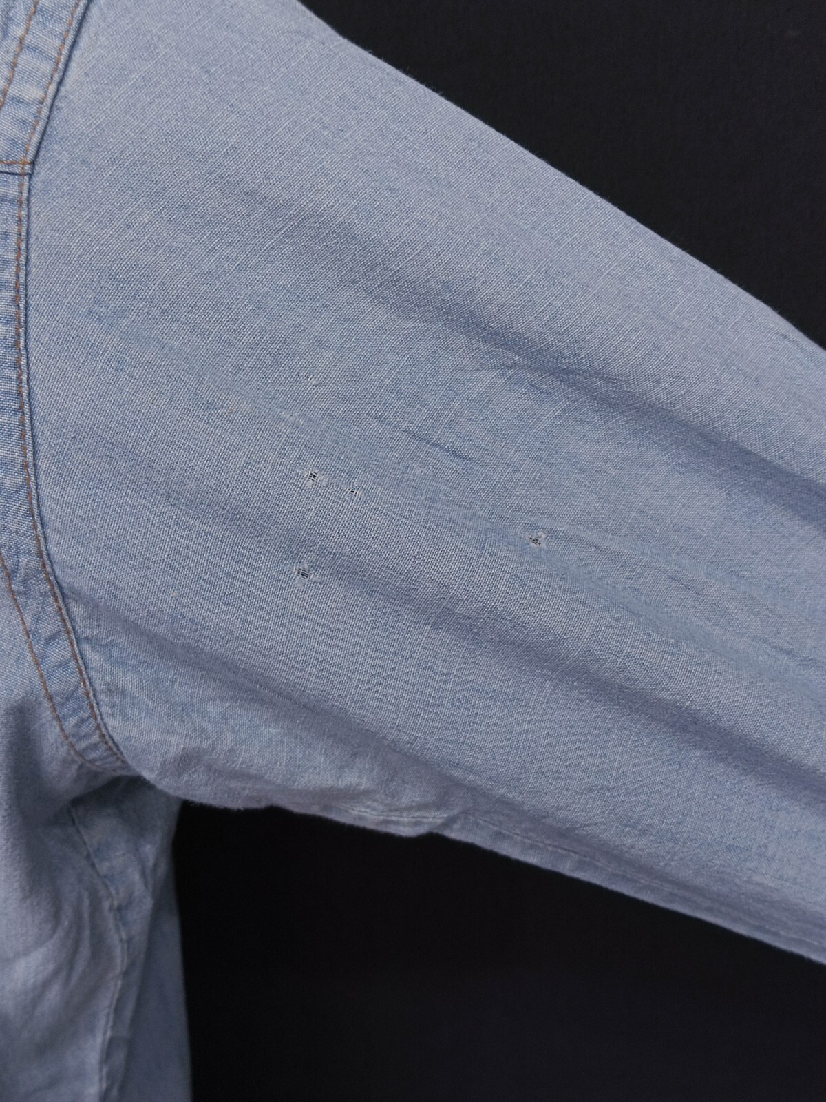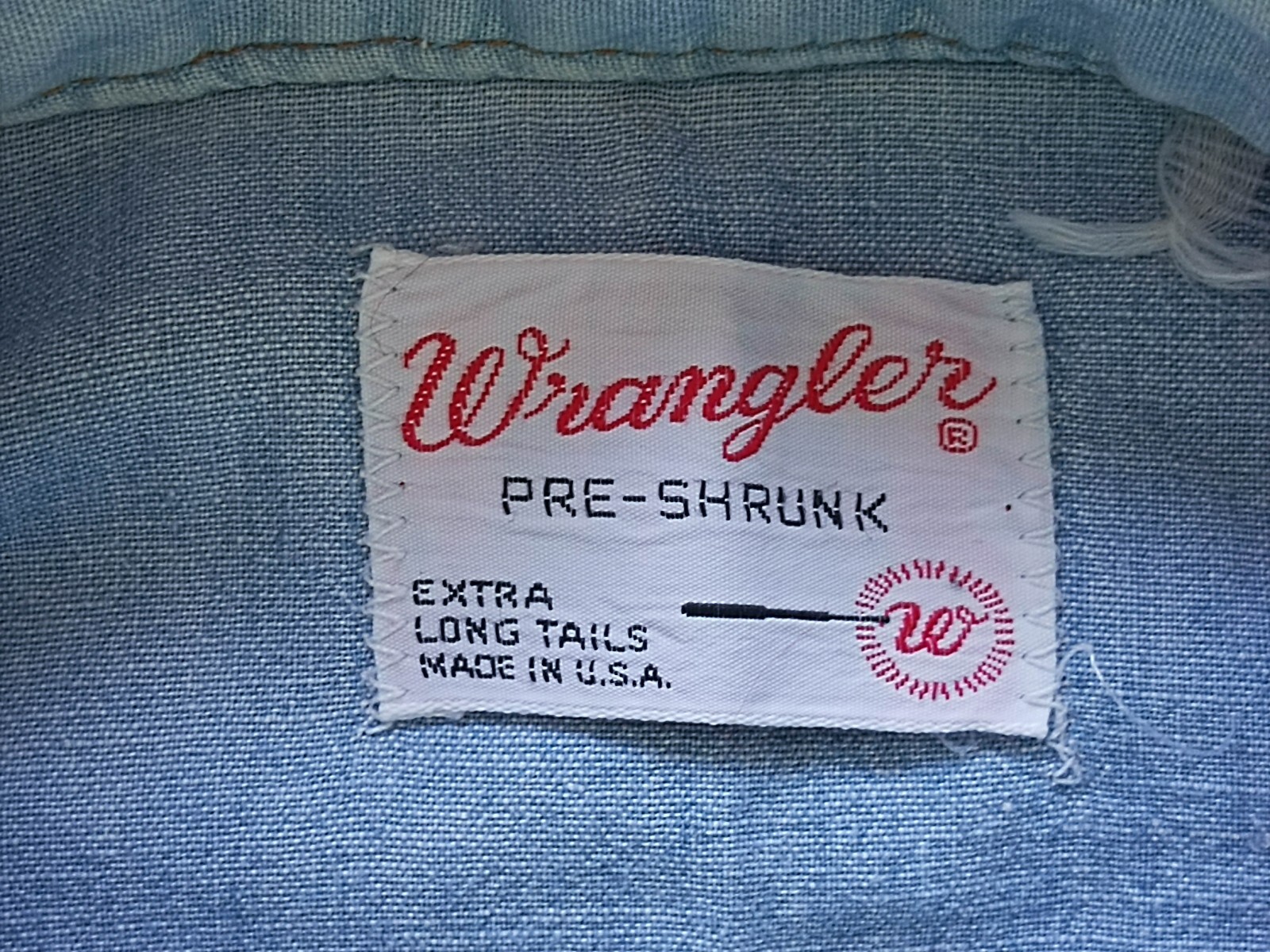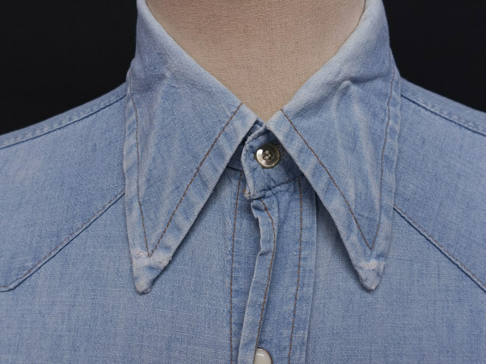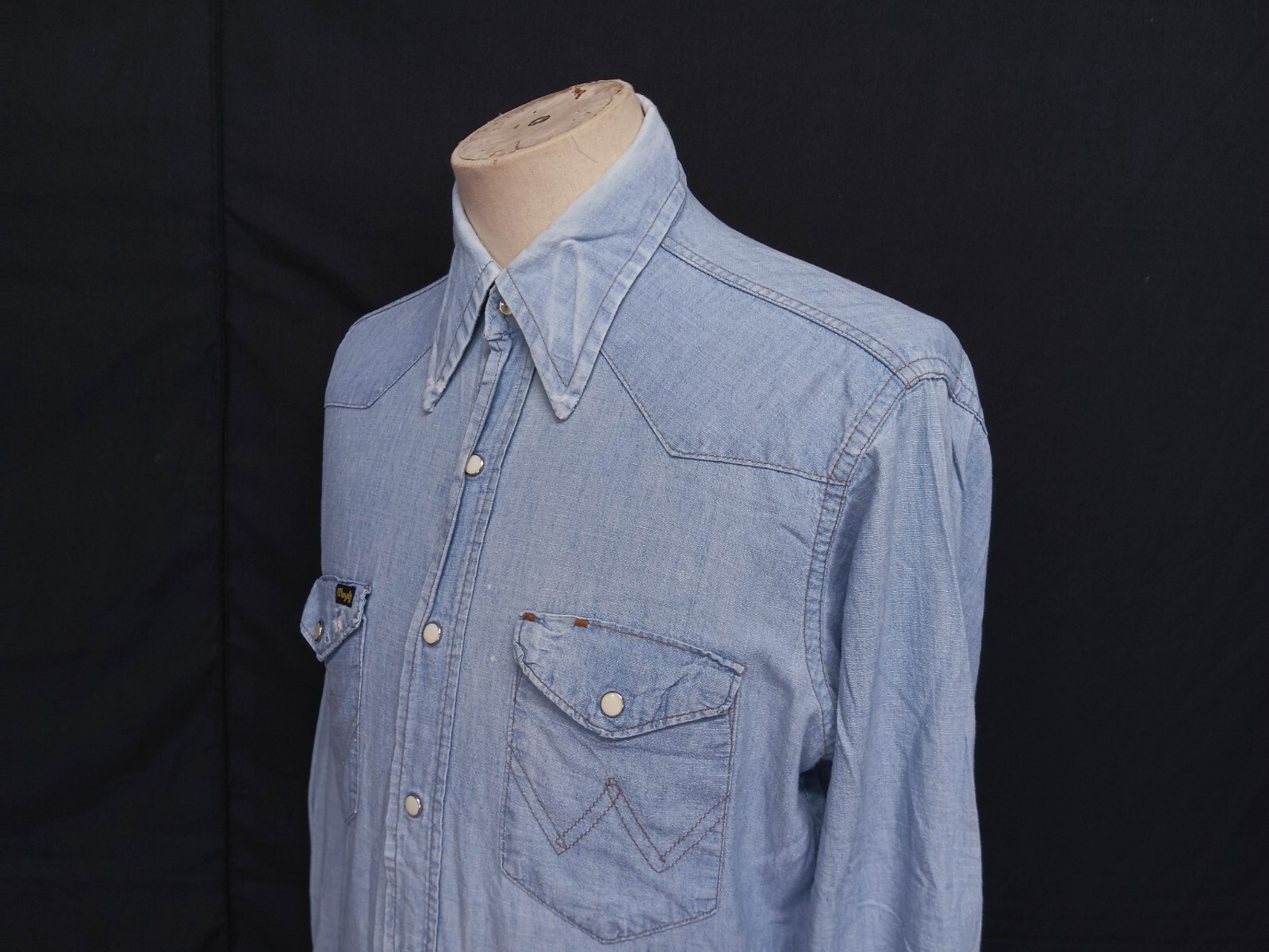Awesome vintage 70's Wrangler chambray pearl snap men's western shirt long sleeves with snaps closure authenticity guaranteed. The shirt has point collar, double flap chest snap pockets with 7 pearl snap buttons closure on front. The color is sky blue with solid pattern. Fabric is 100% cotton chambray. The shirt is pre-owned still in good vintage condition holes, stains on the shirt. Please see the photos. It has been laundered clean and fresh ready to wear. Don't miss out cool and awesome vintage western shirt.