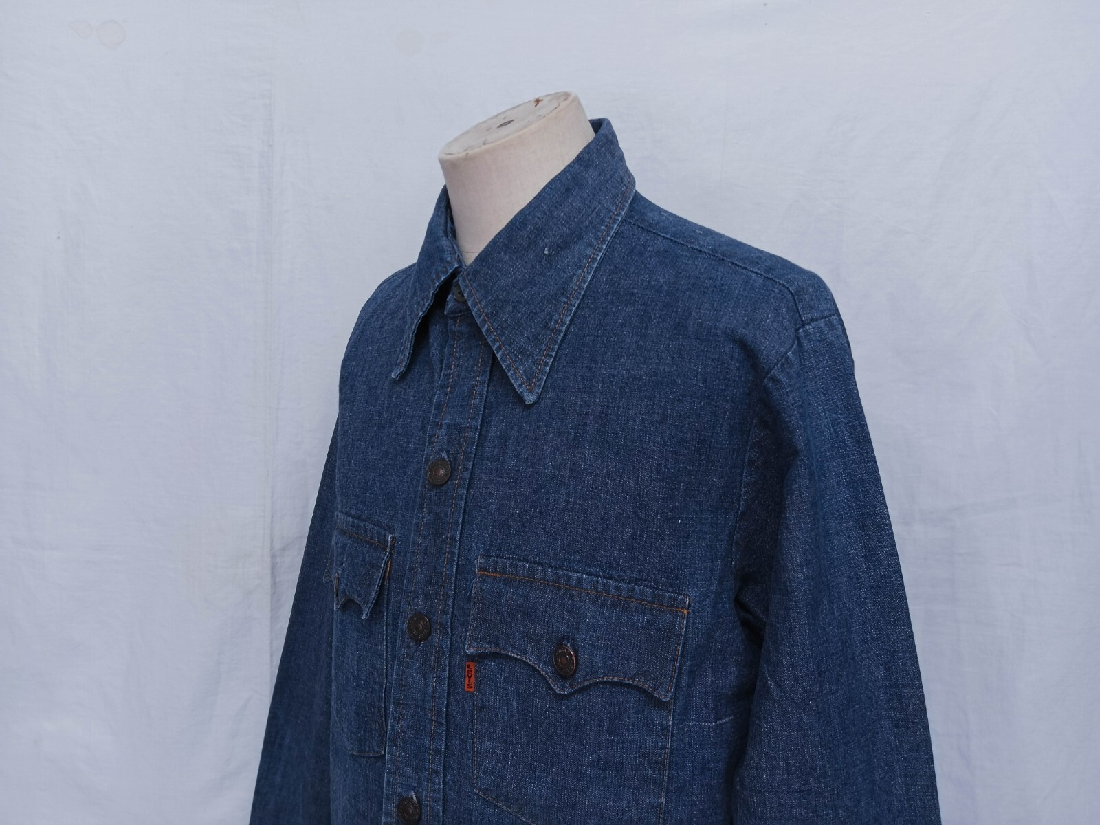 Rockabilly vintage 70's Levi's orange tab denim canvas indigo men's work chore western shirt long sleeves with buttons front authenticity guaranteed. The shirt has point collar, double flap chest button pocket on front. 6 emboss metal buttons closure on front. The color is indigo with solid pattern. Fabric is 100% cotton canvas. The shirt is pre-owned still in mint vintage condition like new shirt no holes, tears, stains. It has been laundered clean and fresh ready to wear. Don't miss out cool and awesome vintage western shirt.