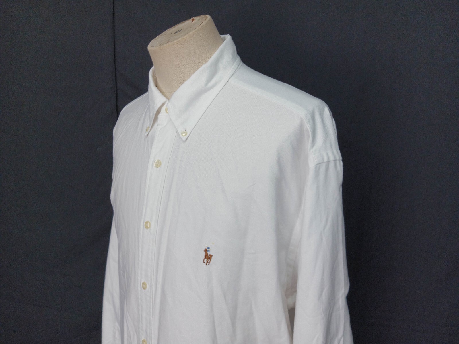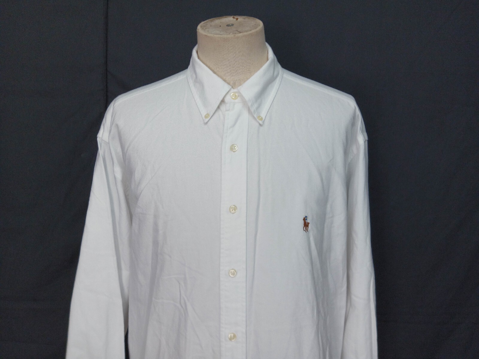 Luxury Ralph Lauren button-down solid white men's dress shirt long sleeve with buttons down authenticity guaranteed. The shirt is button-down collar, rounded cuff, embroidered with pony logo on left chest, 7 buttons closure on front. The color is white with solid pattern. Fabric is 100% cotton oxford. The shirt is pre-owned still in excellent condition, no holes, tears, stains. It has been laundered clean and fresh ready to wear. Don't miss out luxury designer shirt.