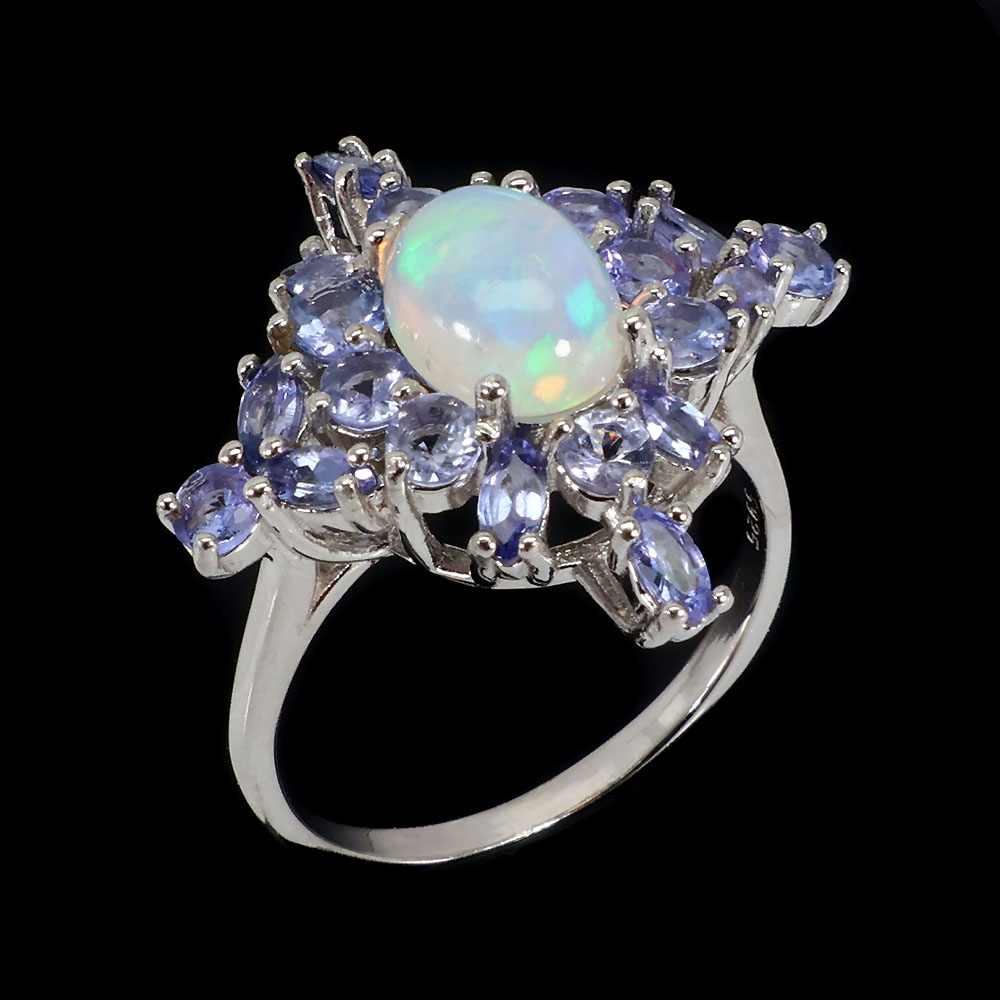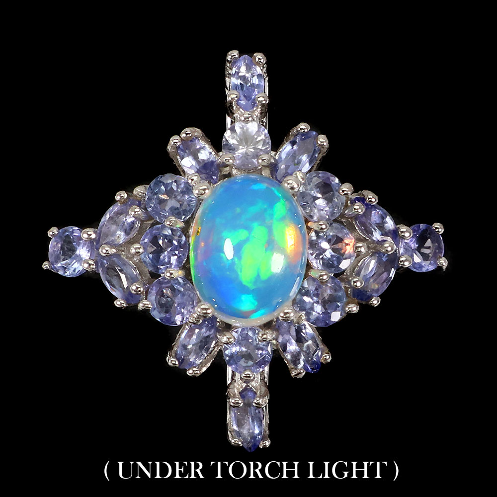 Unheated Oval Fire Opal Rainbow 9x7mm Tanzanite 925 Sterling Silver Ring Size 7