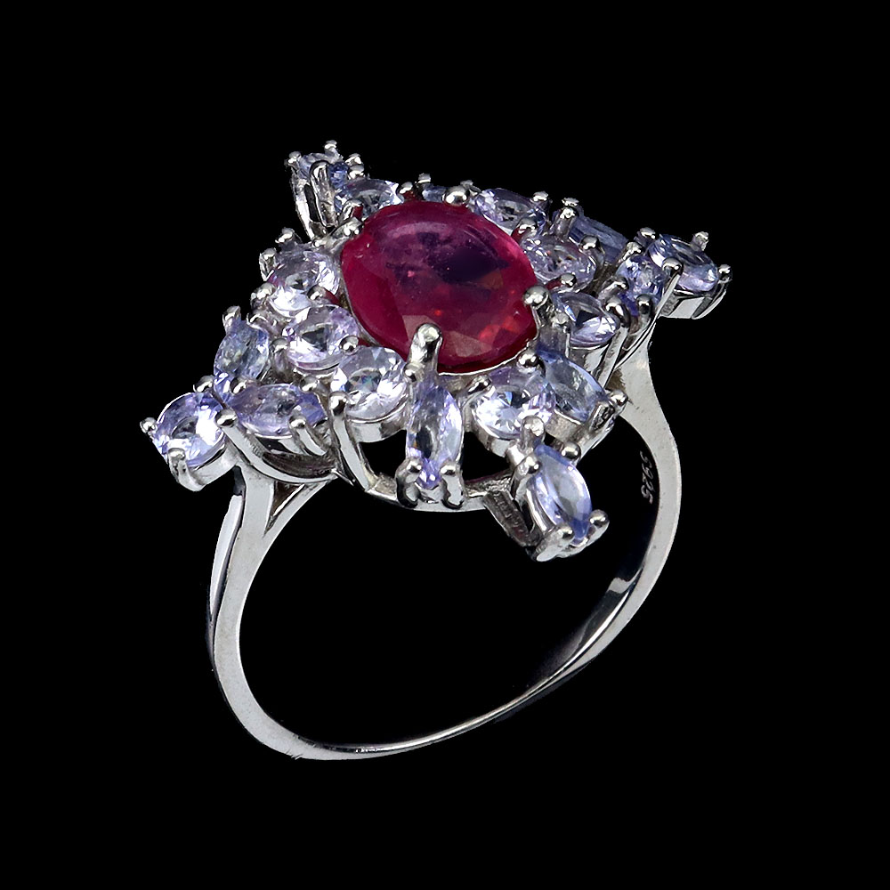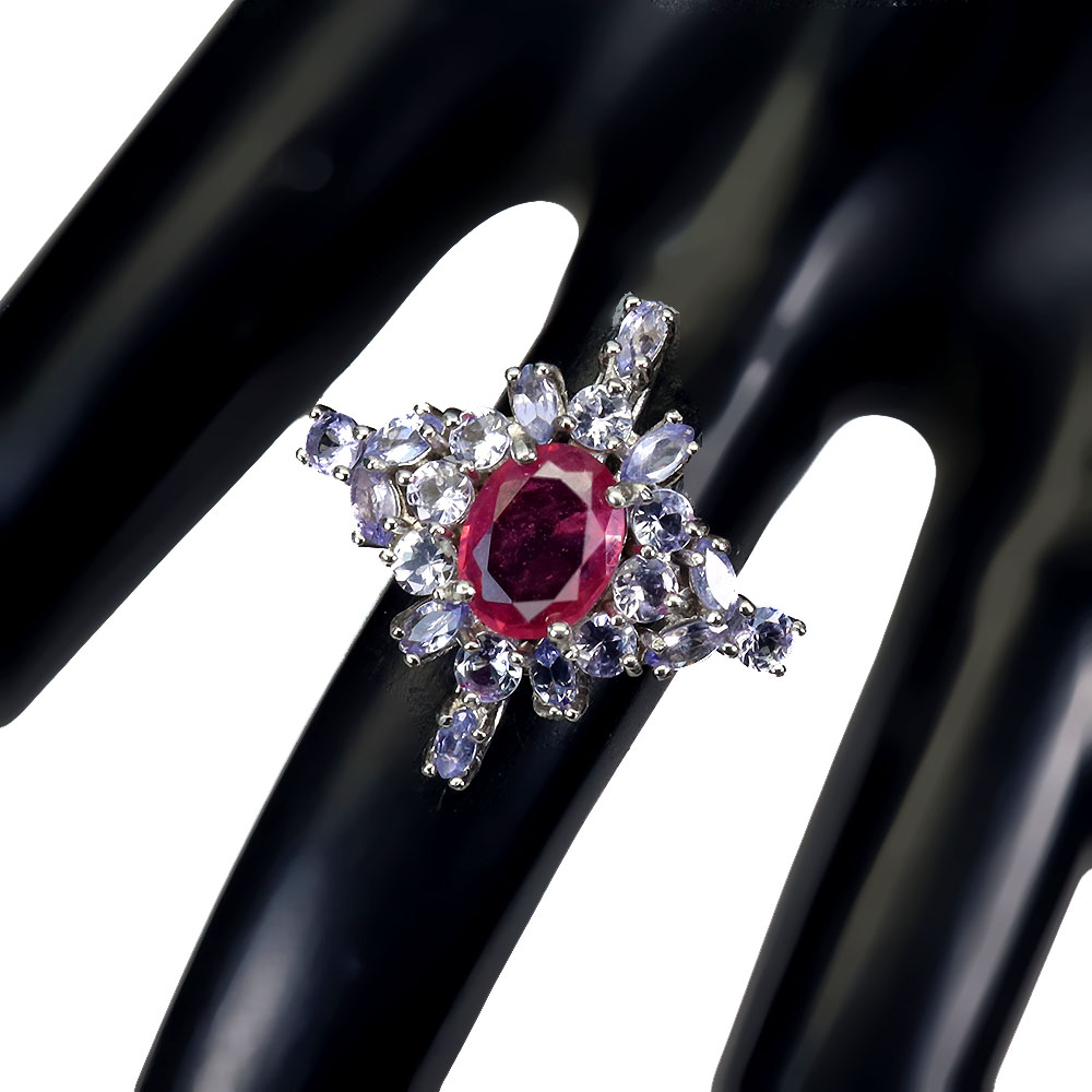 Heated Oval Ruby 9x7mm Tanzanite 14K White Gold Plate 925 Sterling Silver Ring 8