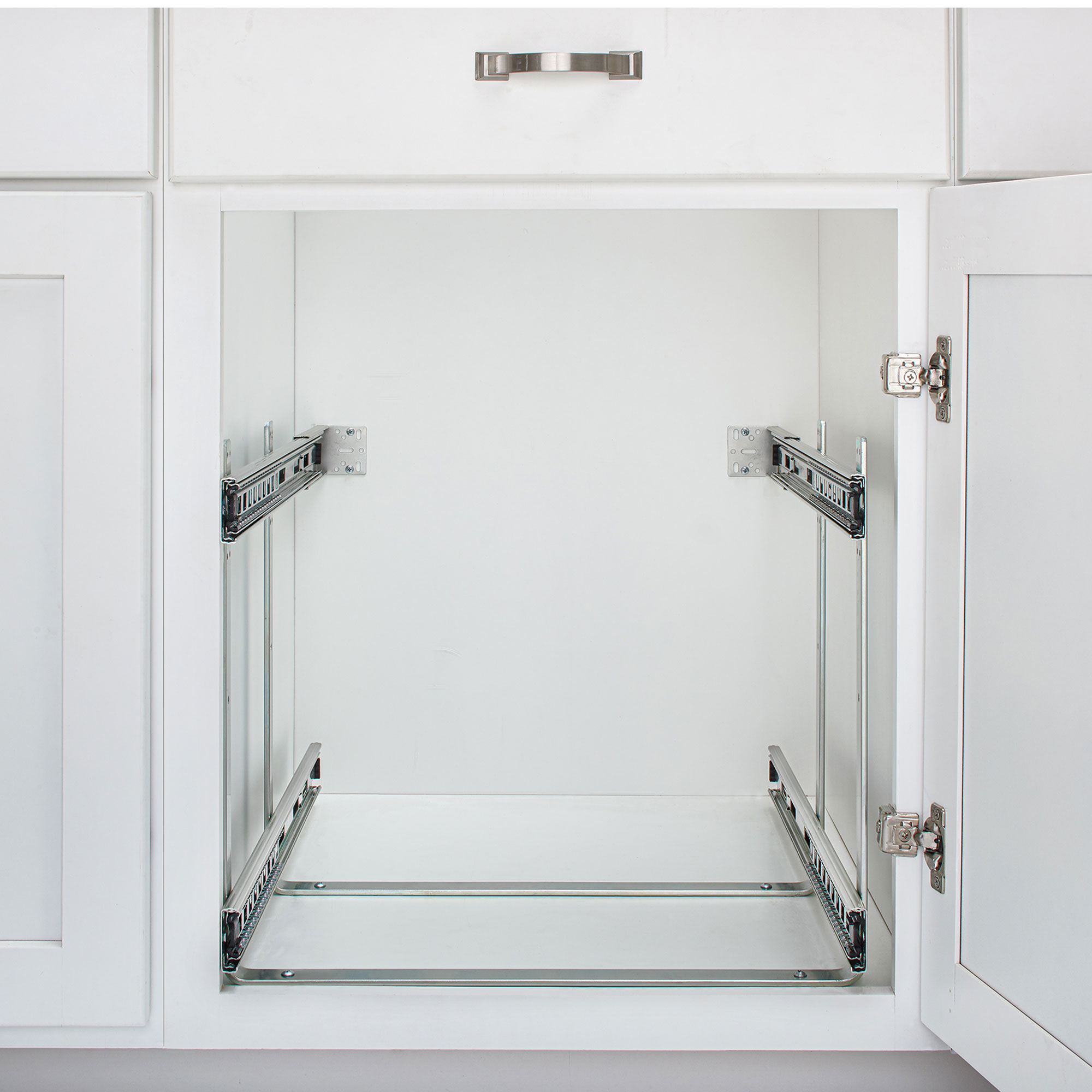 With heavy-gauge construction and ball-bearing slides on both baskets and multiple mounting points this kitchen cabinet organizer can bring order and style to any cabinet. With 100lbs slides on each basket you don’t have to worry about overloading or bending. Both baskets operate independently, and the top basket has 3 height adjustments to maximize space. The U-shape brackets ensure proper alignment and easier installation while mounting to the cabinet floor.