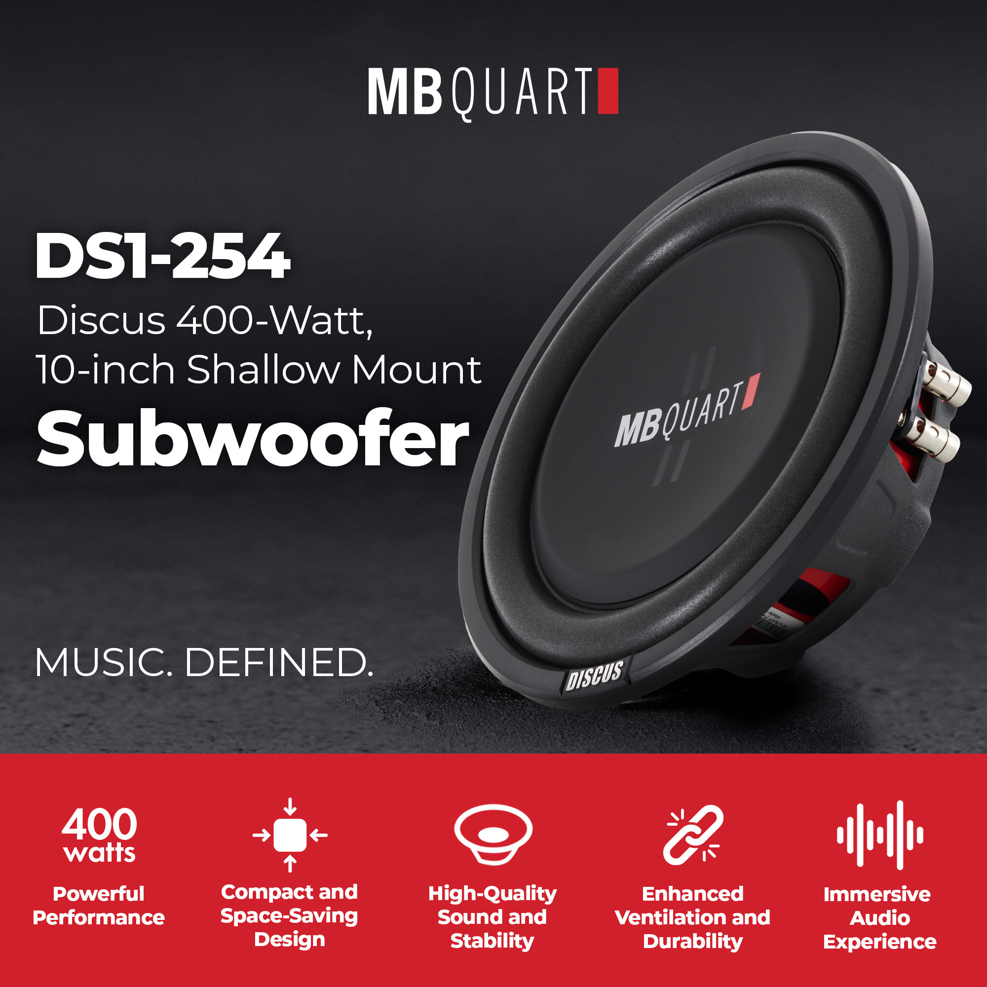 Pump the sound with the MB Quart DS1-254 200-Watt 4-Ohm 10-Inch Shallow Slim Subwoofer for Vehicles.