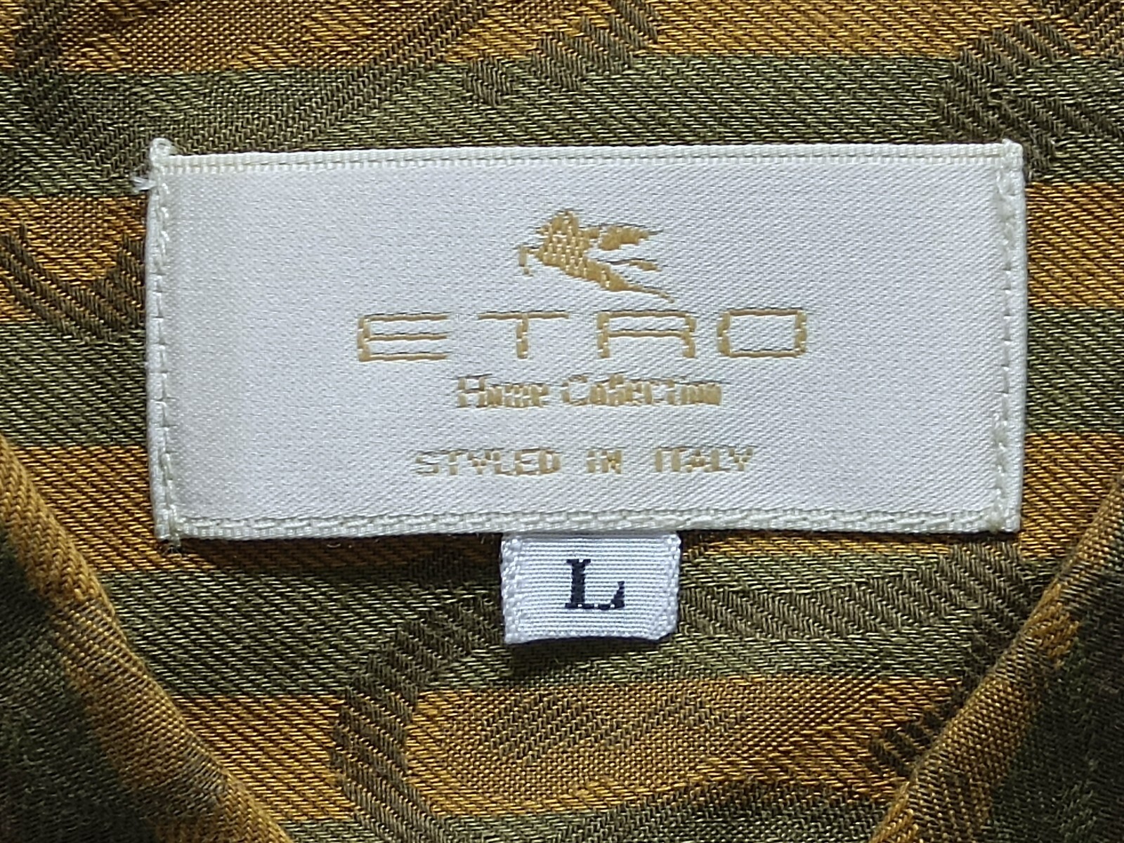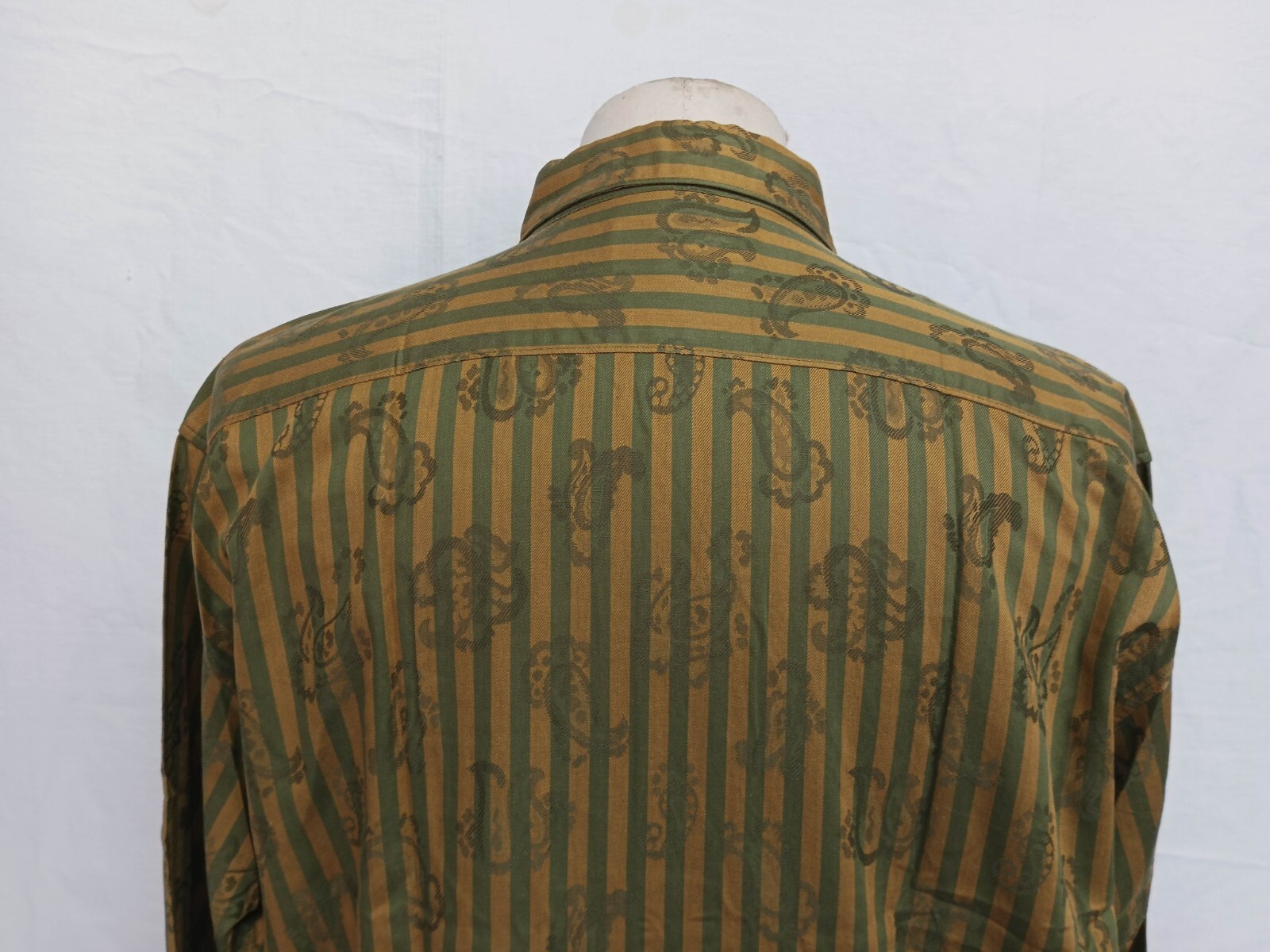 Awesome ETRO Home Collection gold & green striped contrasting paisley men's casual shirt long sleeves with buttons front authenticity guaranteed. The shirt has point collar, single chest pocket on left with 5 emboss buttons closure on front. The color is gold, green with striped and paisley pattern. Fabric is 100% cotton. The shirt is pre-owned still in excellent condition no holes, rips, stains. It has been laundered clean and fresh ready to wear. Don't miss out cool and awesome shirt.