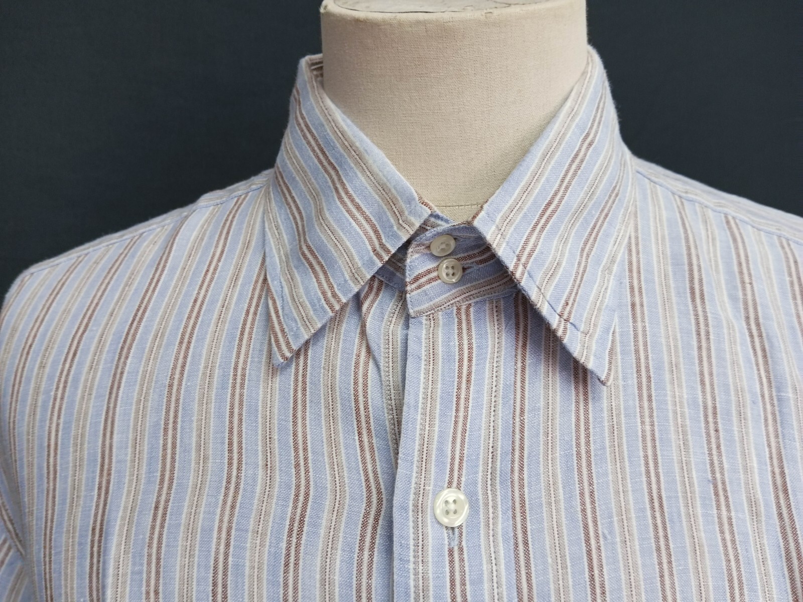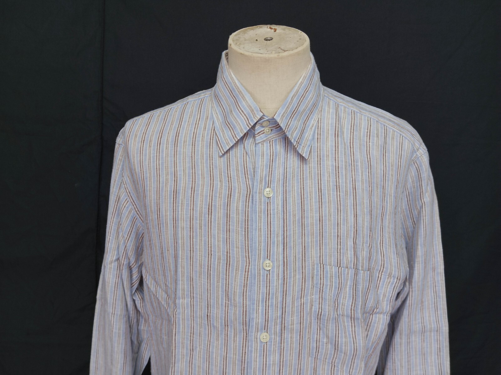 Luxury T.M.Levin brown blue white striped men's dress shirt authenticity guaranteed. Check out awesome designer dress shirt long sleeves with buttons front. The shirt has hidden button-down collar, barrel cuff, single chest pocket on left with 7 buttons closure on front. The color is brown, blue, white with striped pattern. Fabric is 100% linen. The shirt is pre-owned still in excellent condition no holes, tears, stains. It has been laundered clean and fresh ready to wear. Don't miss out luxury and perfect dress shirt.