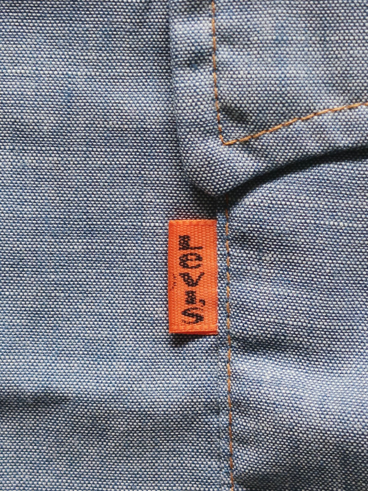 Rockabilly vintage 70's Levi's orange tab chambray sky blue men's work shirt long sleeves with buttons front authenticity guaranteed. The shirt has point collar, double flap chest button pockets with 6 buttons closure on front. The color is sky blue with solid pattern. Fabric is 50% cotton, 50% polyester chambray. The shirt is pre-owned still in excellent vintage condition, there are no holes, tears, stains. It has been laundered clean and fresh ready to wear. Don't miss out cool and awesome vintage shirt.