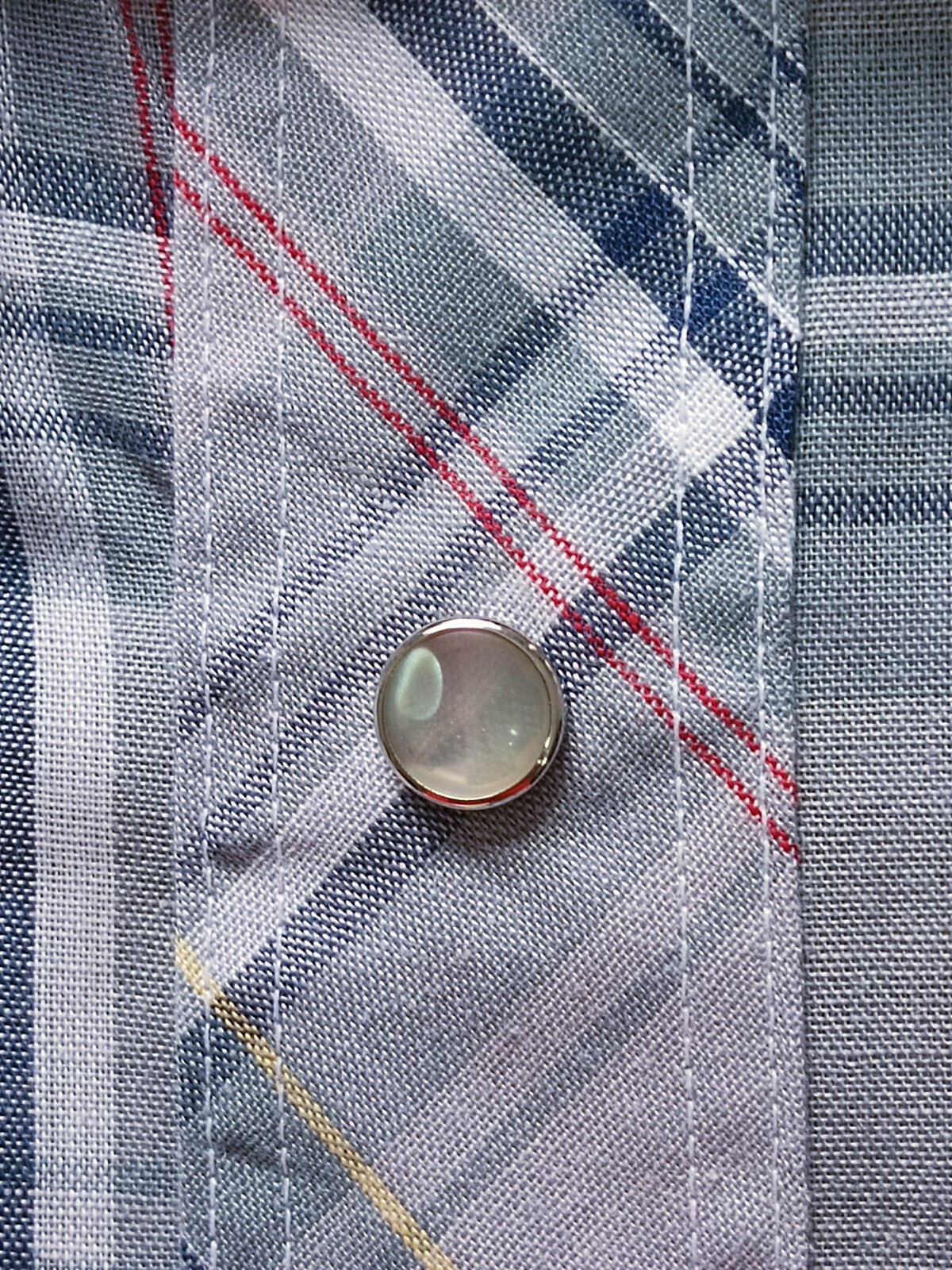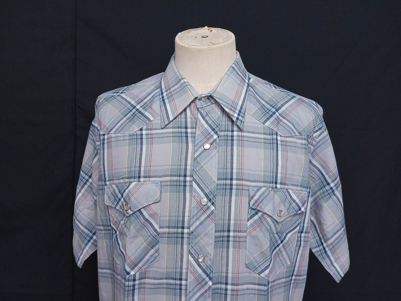 Awesome vintage 90's Wrangler made in U.S.A. pearl snap men's western shirt authenticity guaranteed. Check out awesome vintage shirt short sleeves with snaps closure. The shirt has point collar, double flap chest snap pockets with 7 pearl snap buttons closure on front. The color is gray, blue, red, yellow, white with plaid pattern. Fabric is 65% polyester, 35% cotton. The shirt is pre-owned in excellent vintage condition no holes, tears, stains. It has been laundered clean and fresh ready to wear. Don't miss out cool and awesome vintage western shirt.