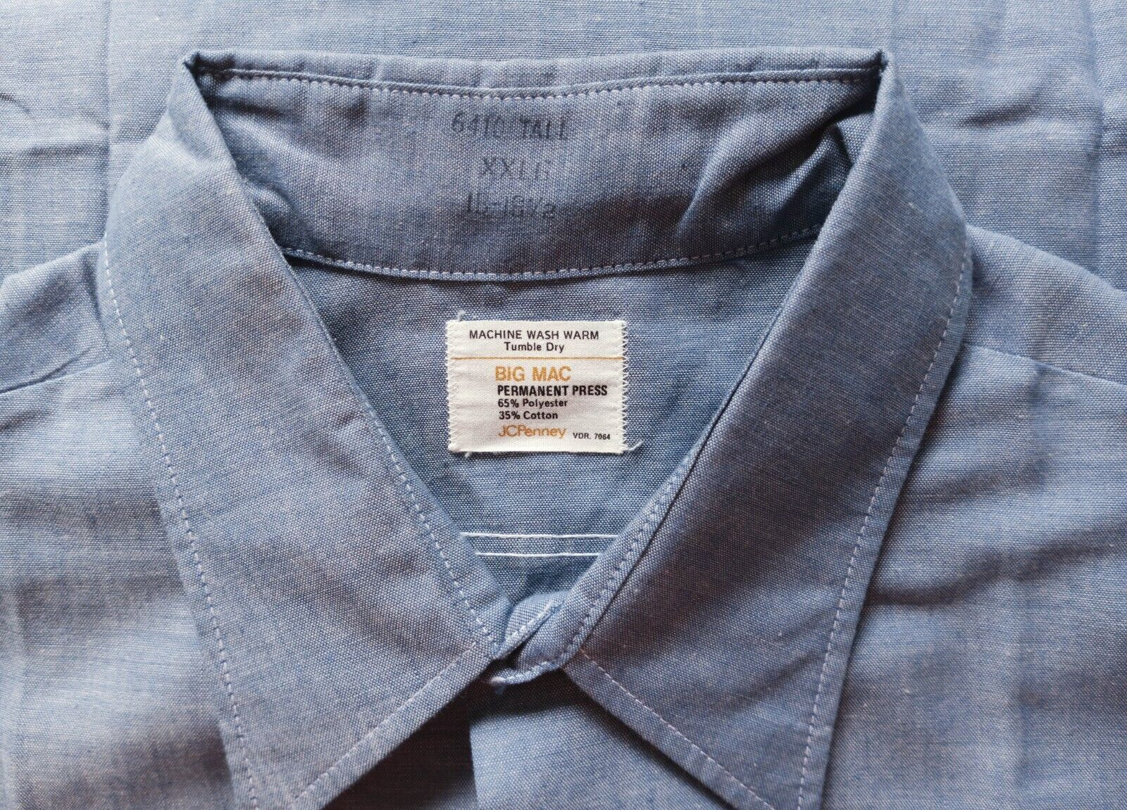 Awesome vintage 70's BIG MAC chambray sky blue men's work shirt authenticity guaranteed. Check out awesome vintage shirt long sleeves with buttons front. The shirt has point collar, double flap chest button pockets with 6 emboss buttons closure on front. The color is sky blue with solid pattern. Fabric is 65% polyester, 35% cotton chambray, selvedge fabric. The shirt is pre-owned in excellent vintage condition no holes, rips, stains. It has been laundered clean and fresh ready to wear. Don't miss out cool and awesome vintage shirt.