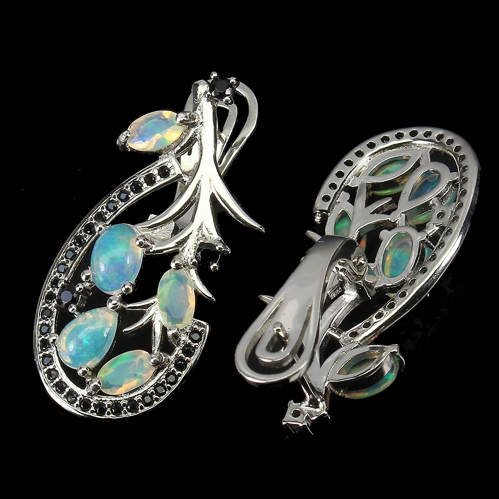 Unheated Oval Fire Opal Rainbow 6x4mm Black Spinel 925 Sterling Silver Earrings