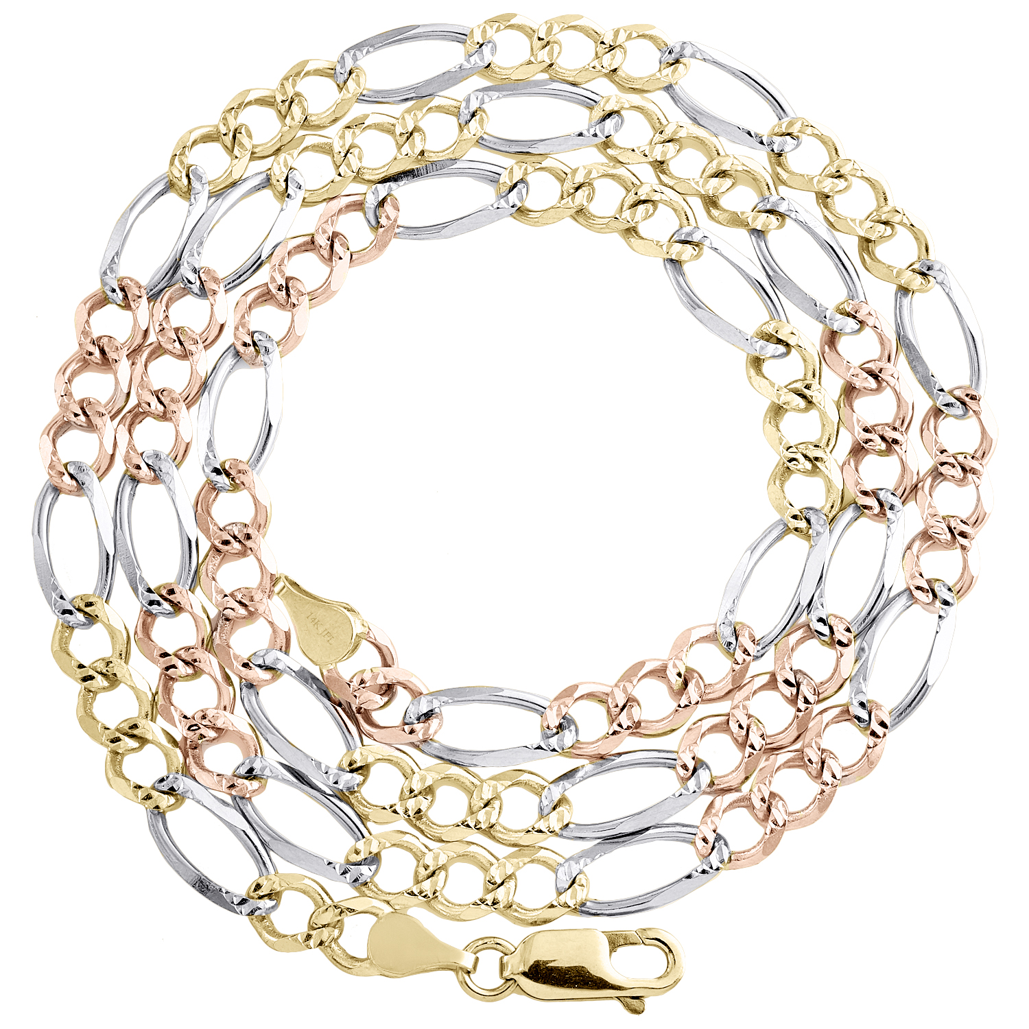 (15.3 gr. of 14K White, Yellow & Rose Gold | Length: 20" | Width: 5mm | Unique Diamond Cut Figaro Link Tri-Color Fancy Statement Chain / Necklace)