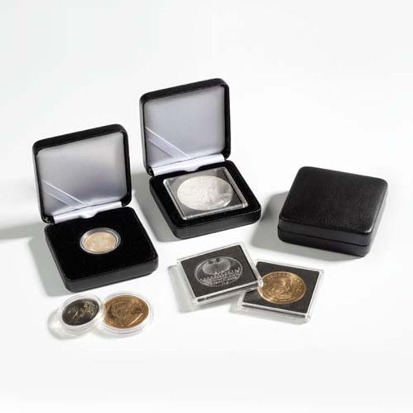 L'étui en métal permet de loger de manière très élégante vos pièces de collection sous capsule. Le tissu intérieur mat ressemblant à du cuir ainsi que l'insertion recouverte de feutrine noire donne à cet étui un caractère très raffiné. Vous trouverez dans le couvercle intérieur blanc un ruban de satin permettant de loger un éventuel certificat. De par sa robustesse, l'étui en métal est parfaitement adapté à l'envoi de pièces par correspondance. Adapté aux capsules des QUADRUM. Dimensions: 65 x 65 x 26 mm