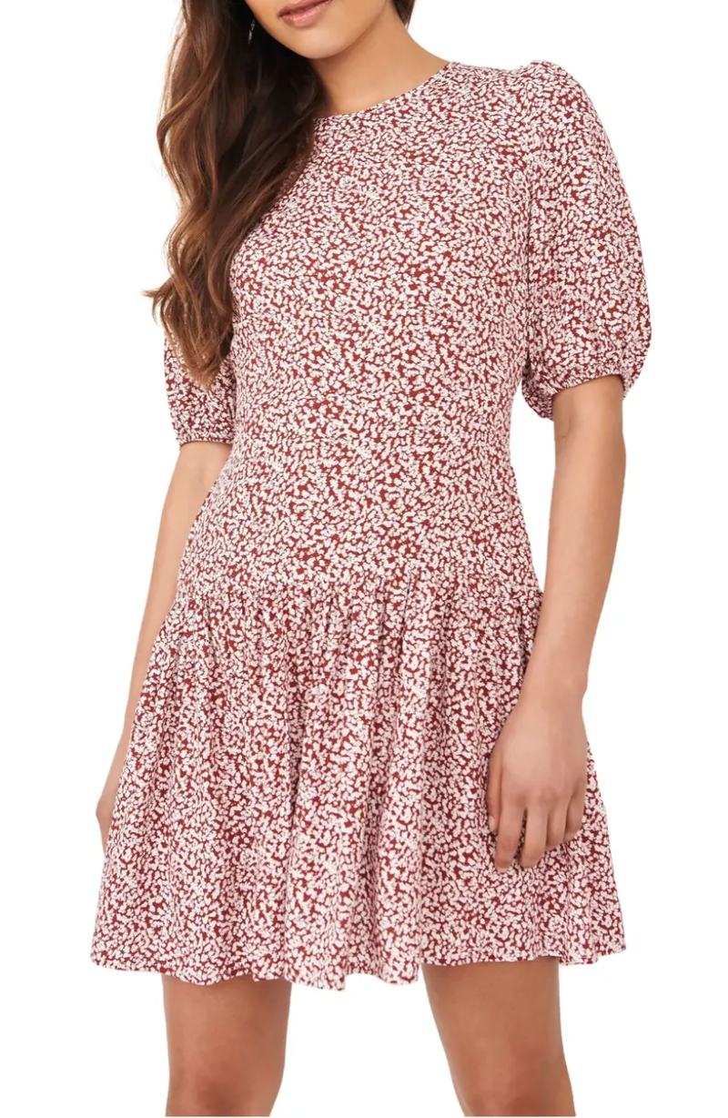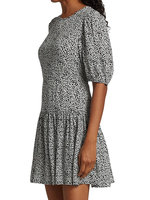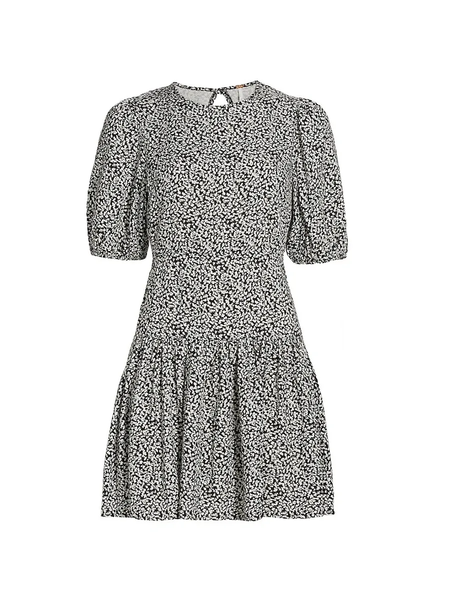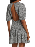 Sweeten the occasion in this flowery mini styled with an eye-catching back cutout and a flouncy ruffled skirt. Back cutout with button-and-loop closure Jewel neckline Short sleeves with elastic cuffs Unlined Elastic waist Tiered hem Made in Turkey 38" length (size Large)