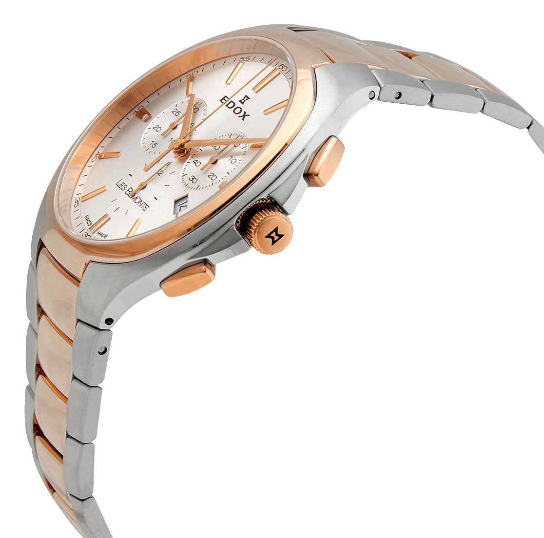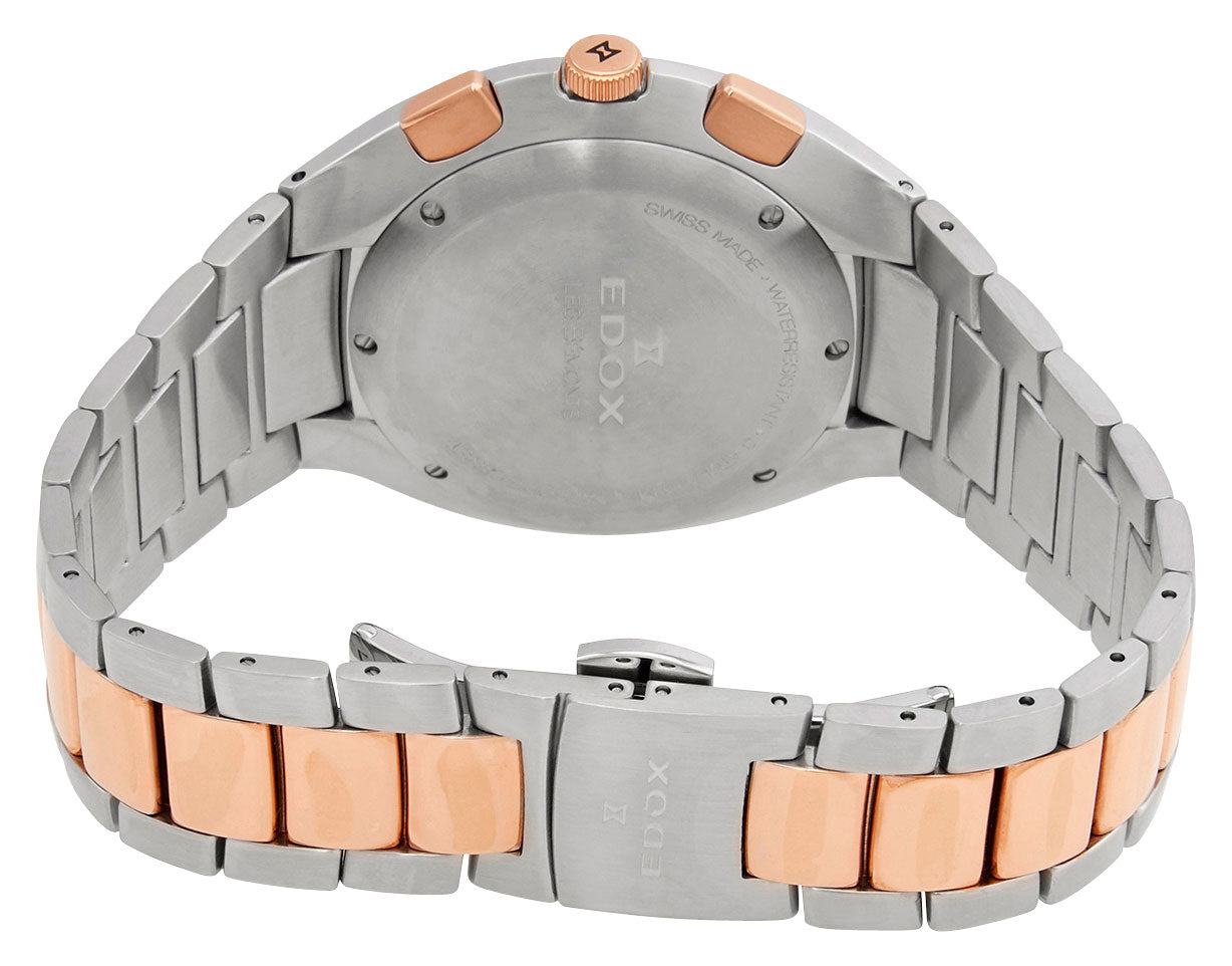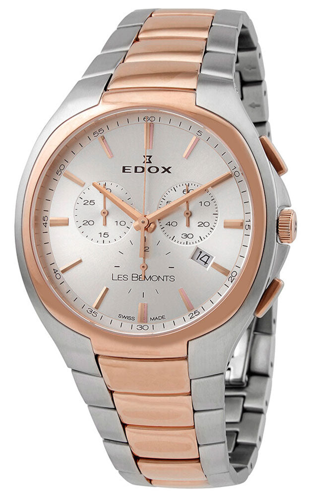 Named after a picturesque forest situated near the Edox factory, the Les Bemonts collection features classical design combined with pure, timeless lines and equipped with a variety of high-quality Swiss-made movements. This elegant Les Bemonts in an ultra-slim chronograph form features a 42 mm two-tone stainless steel case that holds a silver-tone sunray dial under a scratch-resistant sapphire crystal and bordered by a polished fixed bezel in rose gold PVD. It has rose gold-tone baton-style hands and applied indices as hour markers. Three subdials located at the 3, 6, and 9 o'clock positions display the 60-second, 12-hour, and 30-minute counters respectively while the date aperture sits at the 4 o'clock position. The protected rose gold-tone crown flanked with rose gold-tone pushers lies at the 3 o'clock position which operates the time, date, and chronograph functions. This watch has an integrated two-tone stainless steel bracelet with matching rose gold-tone central links and is secured by a stainless steel folding clasp with push-button release. This watch has a solid caseback wherein underneath lies the Ronda-based caliber 102, a Swiss quartz chronograph movement, and is water-resistant up to 30 meters/100 feet.
