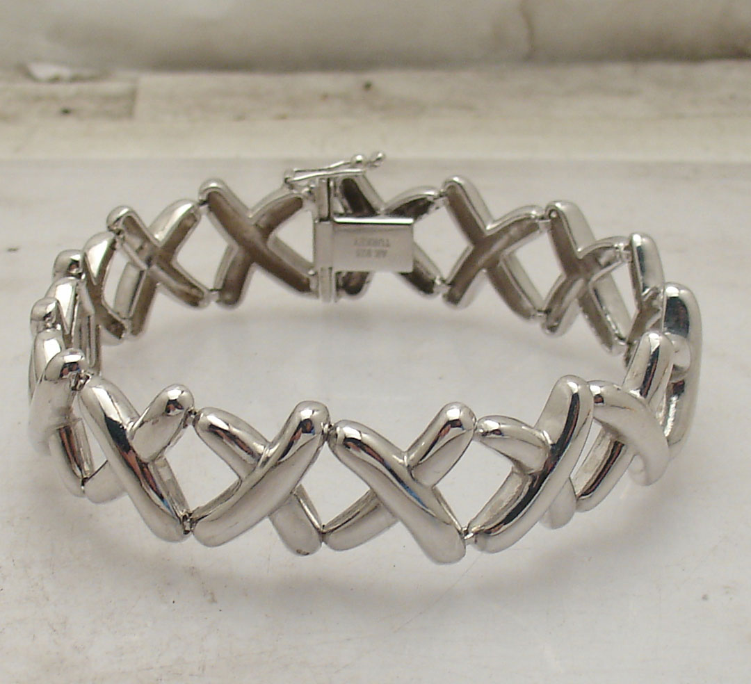 An elegant great detailed sterling silver bracelet. Offering timeless elegance, our handcrafted x-link bracelet is the kind of piece that always feels completely right. Gorgeous interlocked links, brightly polished finish, the perfect width and weight. Includes a rhodium finish to prevent tarnishing. 16.30mm wide. real sterling silver link bracelet.