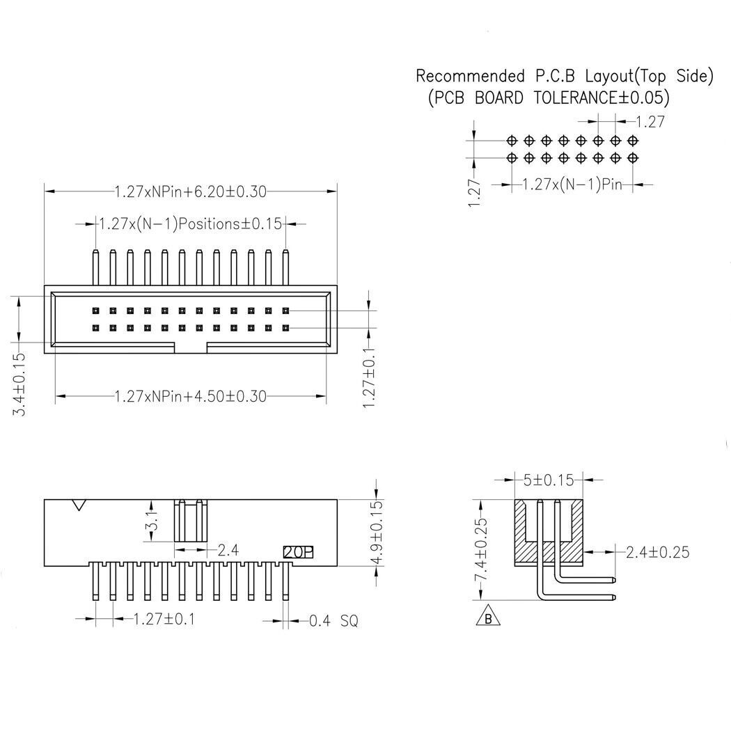 Features: Pitch: 1.27mm. Gender: Male Number of Pins: 2x5Pin Body Orientation: Right Angle Type of Row: Double Row
