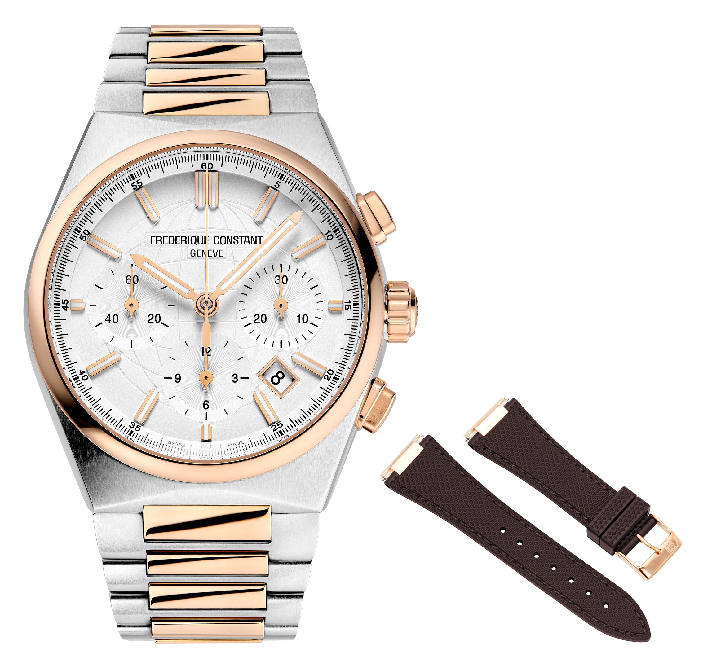 Like all of our watches, this Frederique Constant Highlife Automatic Chronograph Two-Tone Stainless Steel Silver-Tone Dial Interchangeable Brown Rubber Strap Date Mens Watch is brand new and comes in its original packaging.
