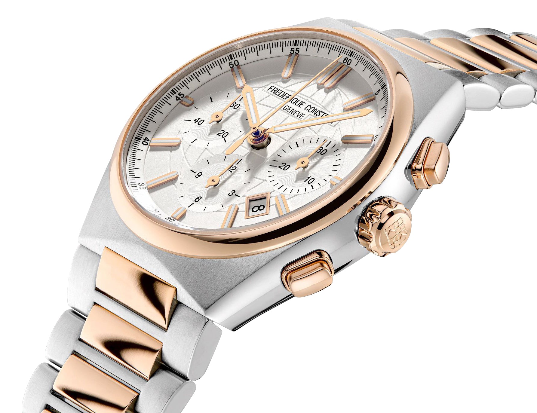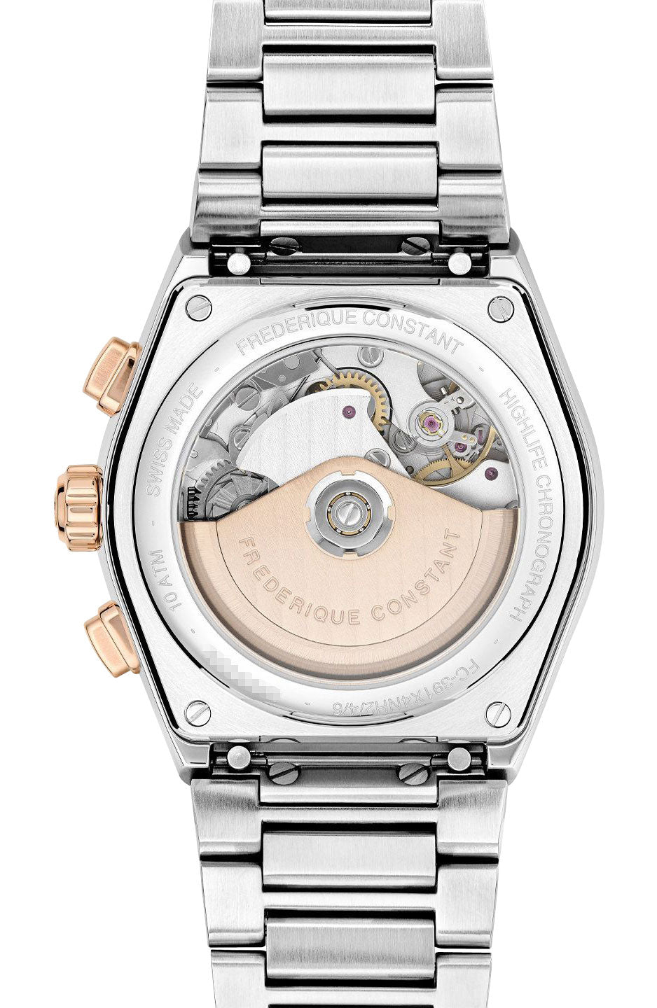 Launched over 20 years ago and based on revised and improved fundamentals acquired from Frederique Constant's lengthy experience, the Highlife collection sports a new case design, interchangeable straps and a detailed, decorated dial. This handsome chronograph features a 41 mm two-tone stainless steel case that holds a pristine matte silver-tone dial under a scratch-resistant sapphire crystal and a polished rose gold PVD fixed bezel. It has matching rose gold-tone, luminescent hands, and applied indices along the perimeter of its central globe motif. Three subdials located at the 3, 6, and 9 o'clock positions display 30-minute, 12-hour and 60-second counters respectively while the date display is between the 4 and 5 o'clock positions. Time and chronograph functions are operated via the rose gold-tone crown and pushers along the right side of the case. This watch is equipped with a stainless steel bracelet with rose gold-tone center links that sport a smoothly integrated design and is secured by a folding clasp with push buttons. It also comes with an interchangeable brown rubber strap for a variety of looks. This watch has a transparent caseback showcasing the caliber FC-391, a Swiss automatic chronograph movement that boasts a power reserve of 60 hours and is water-resistant up to 100 meters/330 feet.
