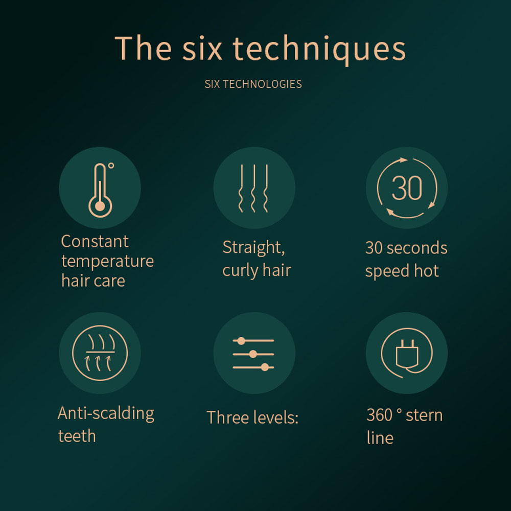 -Tourmaline Ceramic Technology: The tourmaline ceramic coating releases negative ions to protect moisture from loss, leaving your hair shiny and silky.