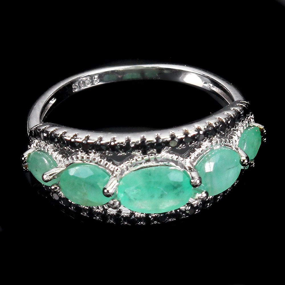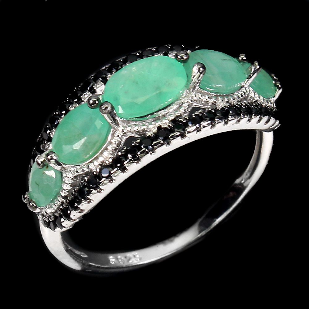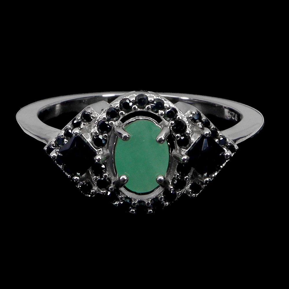 Unheated Oval Green Emerald 6x4mm Black Spinel 925 Sterling Silver Ring Size 7