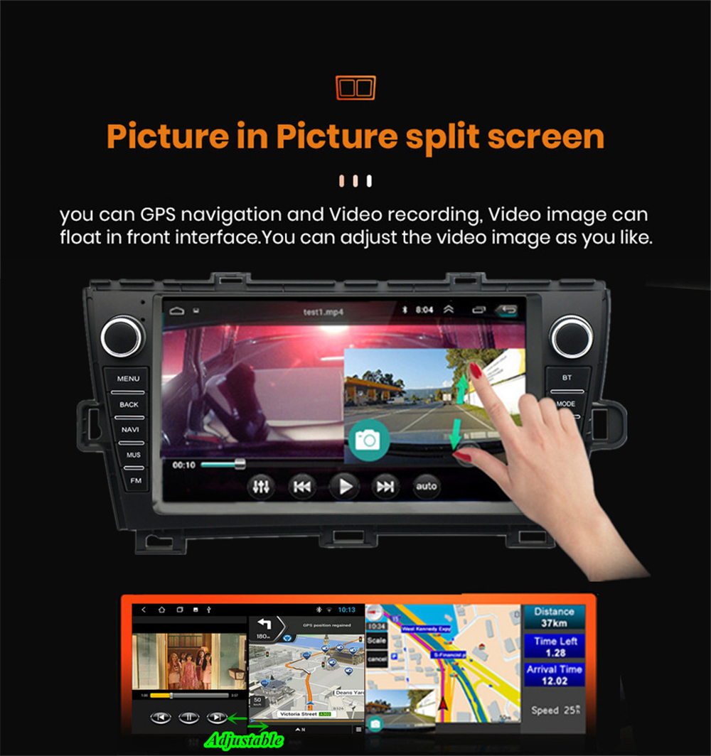 Display | - Touch Screen: Yes - Resolution: 1024*600 - Capacitive or Resistance Screen: Capacitive - Built-in Clock and Calendar: Yes, show real time and can use network-provided time - Main Menu Status Bar display: Can be changed to Music/Radio/BT-Stereo Player and Clock/Date/Week - Change Apps-Icon Position: Yes - Picture in picture split screen:Yes Split screen feature enables you to use two applications at the same time. For example running Navigation with Music Player or Radio with Navigation at the same time. Optimum convenience for both the driver and passengers. |