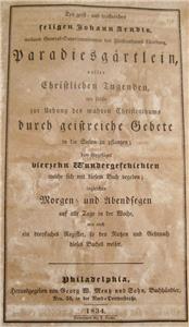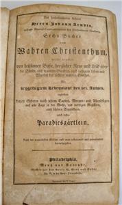 - The title page says, "Des Hocherleuchteten Lehrers Herrn Johann Arndts, Weiland General-Superintendenten des Fürstenthums Lüneburg, Sechs Bücher vom Wahren Christenthum: Welche Handeln von Heilsamer Busse, Herzlicher Reue und Leid Über die Sünde, und Wahrem Glauben, Auch Heiligen Leben und Wandel der Rechten Wahren Christen - Mit beygefügtem Lebenslauf des sel. Herrn Autors, ingleichen kurzen Gebeten nach jedem Capitel, Morgen- und Abendsegen auf alle Tage in der Woche, und nöthigen Registern, auch schönen Sinnbildern, nebst dessen Paradiesgärtlein - Nach der accuratesten Edition aufs neue collationist und unverandert herausgegeben - Philadelphia Mentz und Rovoudt (nachfolger von Georg W. Menz und Sohn)"