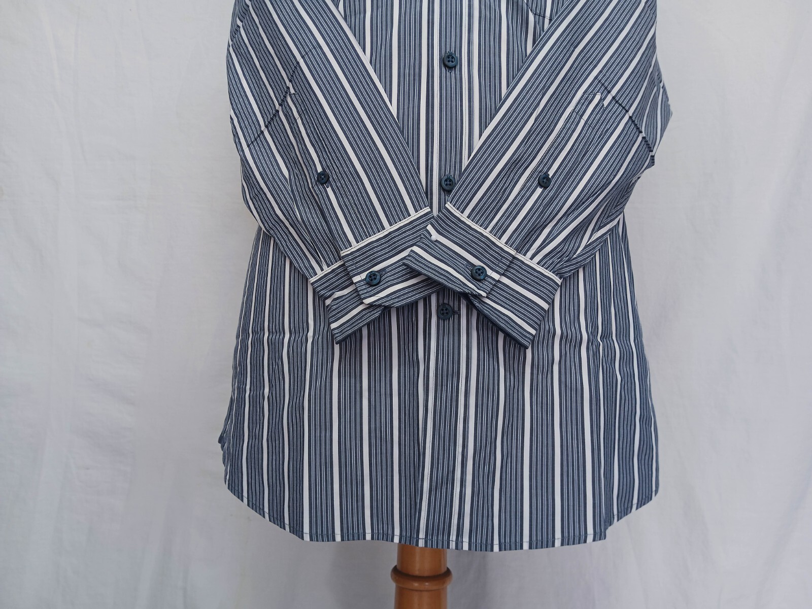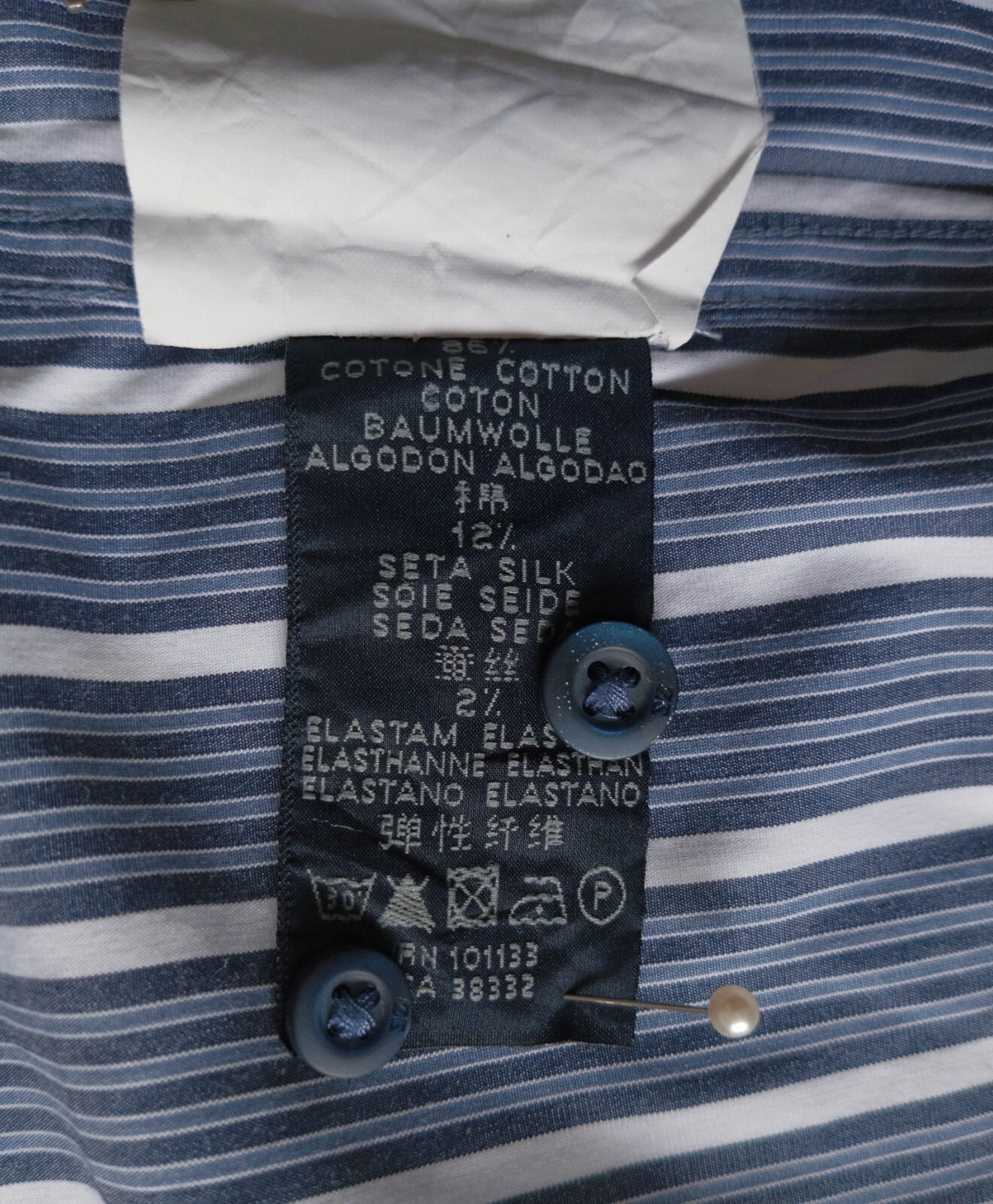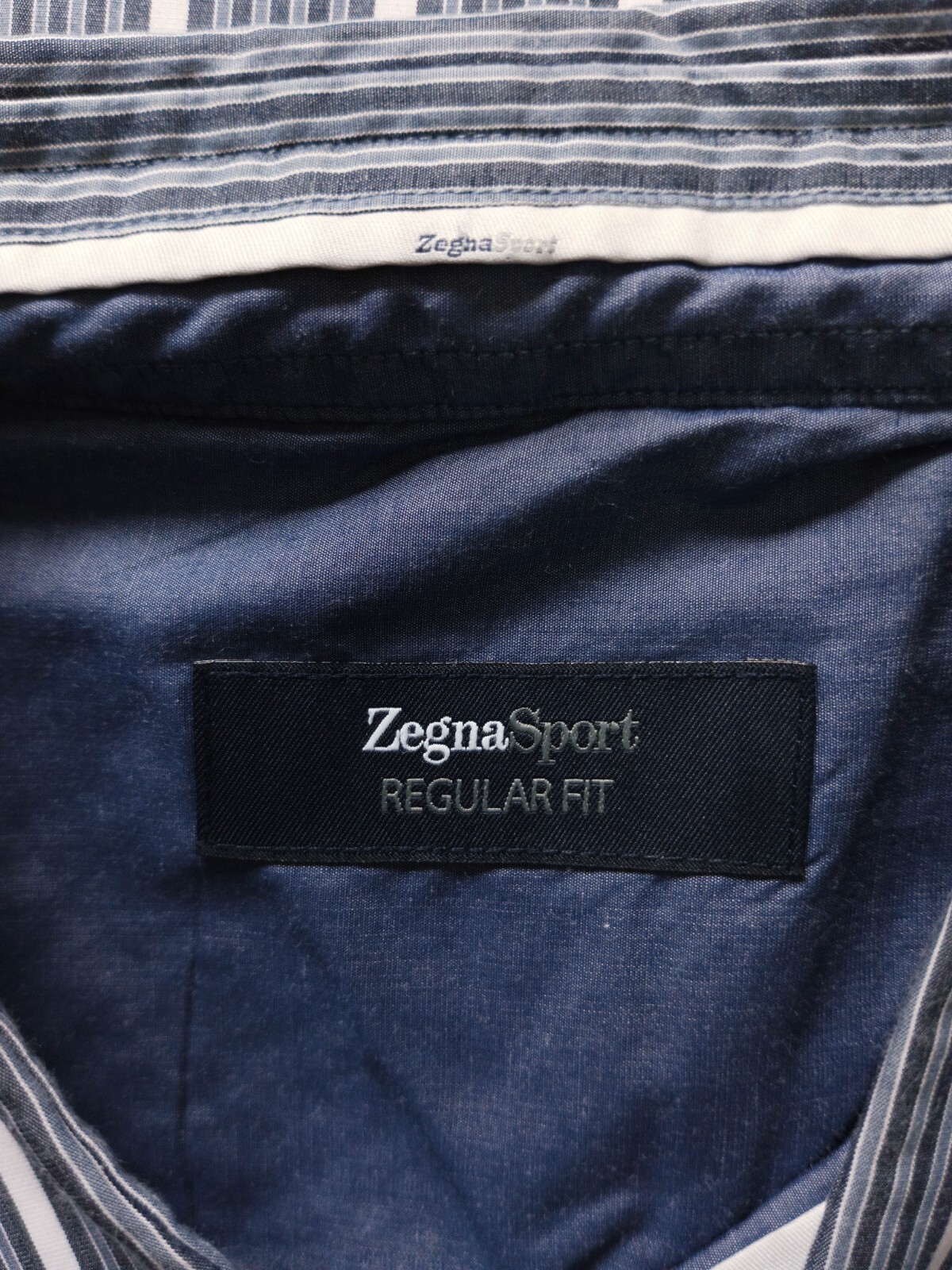 Awesome Zegna Sport men's casual shirt authenticity guaranteed. Check out awesome designer shirt long sleeves with buttons front. The shirt has point collar, single chest pocket on left with 7 buttons closure on front. the color is white, blue, dark blue striped pattern. Fabric is 86% cotton, 16% silk, 2% elastane. The shirt is pre-owned still in excellent condition no holes, tears, stains. It has been laundered clean and fresh ready to wear. Don't miss out gorgeous designer shirt.