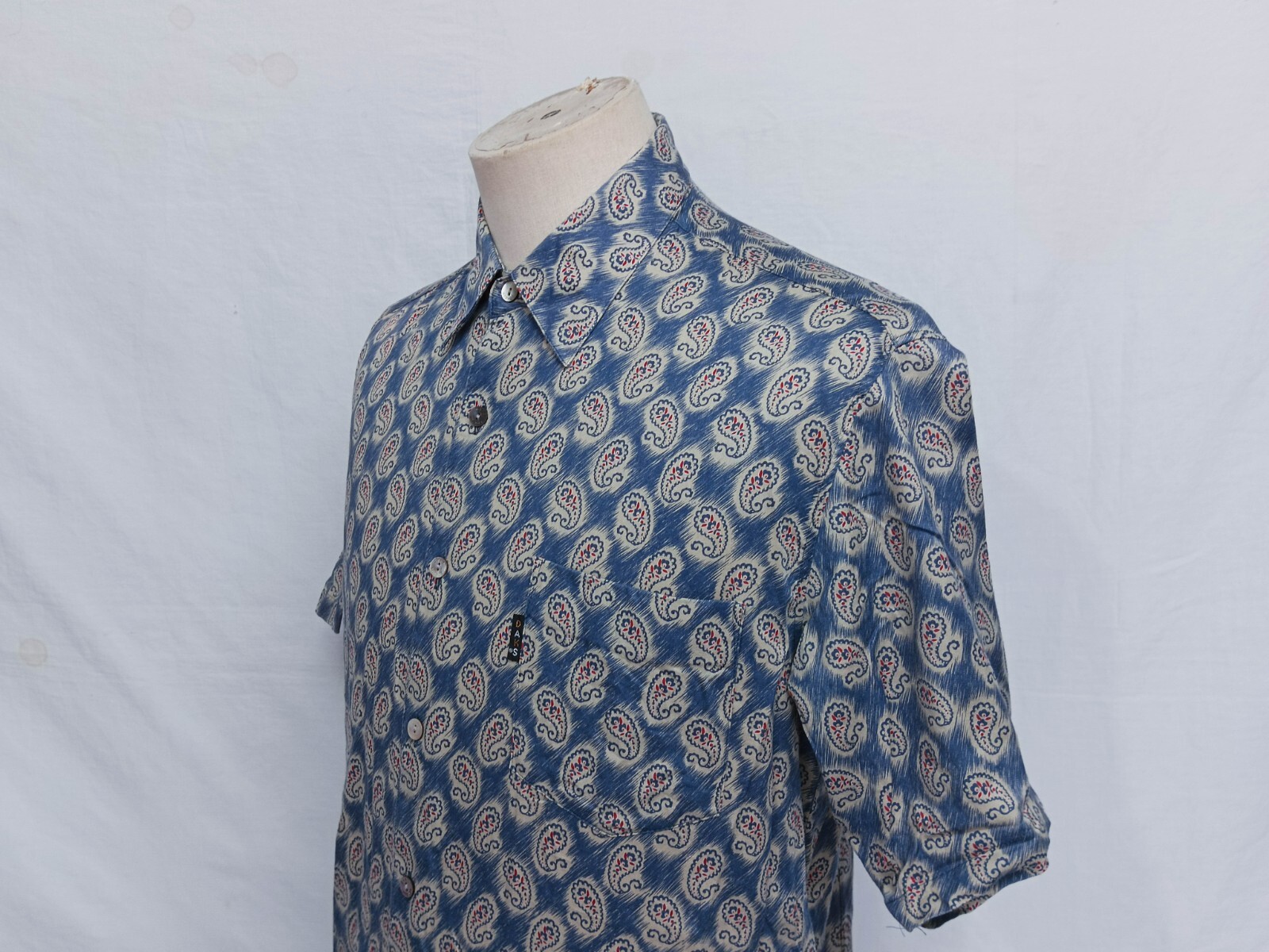 Awesome DAKS London blue paisley men's casual shirt authenticity guaranteed. Check out cool and awesome shirt short sleeves with buttons front. The shirt has point collar, single chest pocket on left with 7 emboss mother of pearl buttons closure on front. The color is blue, cream, red with paisley pattern. Fabric is 100% cotton. The shirt is pre-owned still in excellent condition no holes, tears, stains. It has already laundered clean and fresh ready to wear. Don't miss out awesome designer shirt.