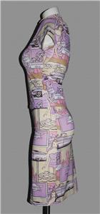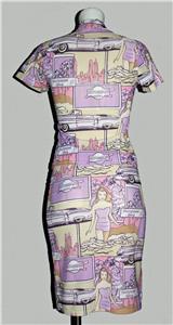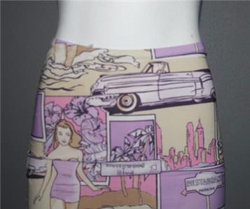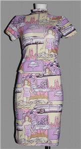 VTG Charbell Paris 2-Pc Bodycon Skirt & Top. Collage of retro cars, bathing suits, etc. Pullover top. Elastic waistband skirt. Skirt has lower 3-1/2" side vents. Machine wash, 90% stretchy polyester, 10% elastane. I am estimating this to be a women's small. Made in France. Approx. measurements: