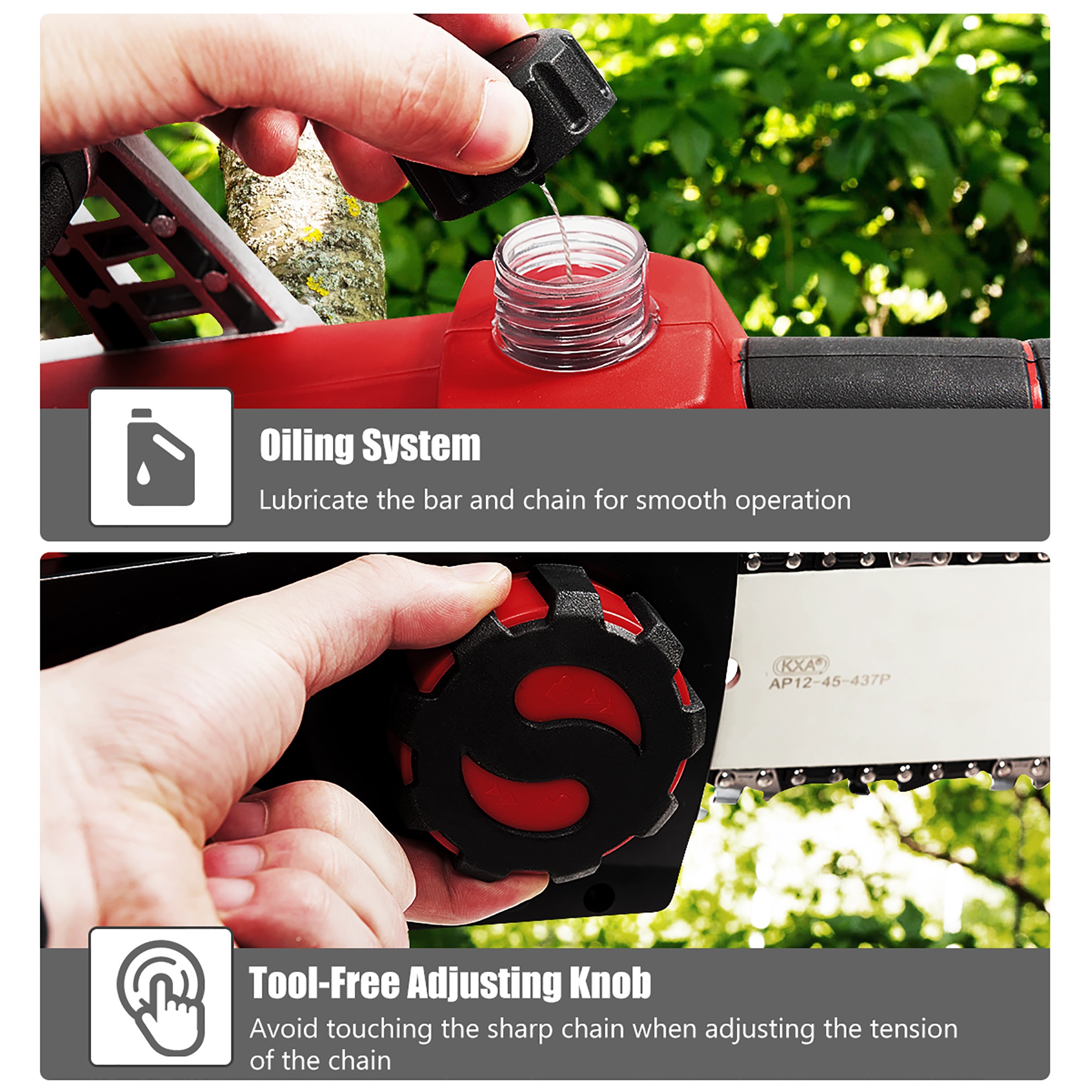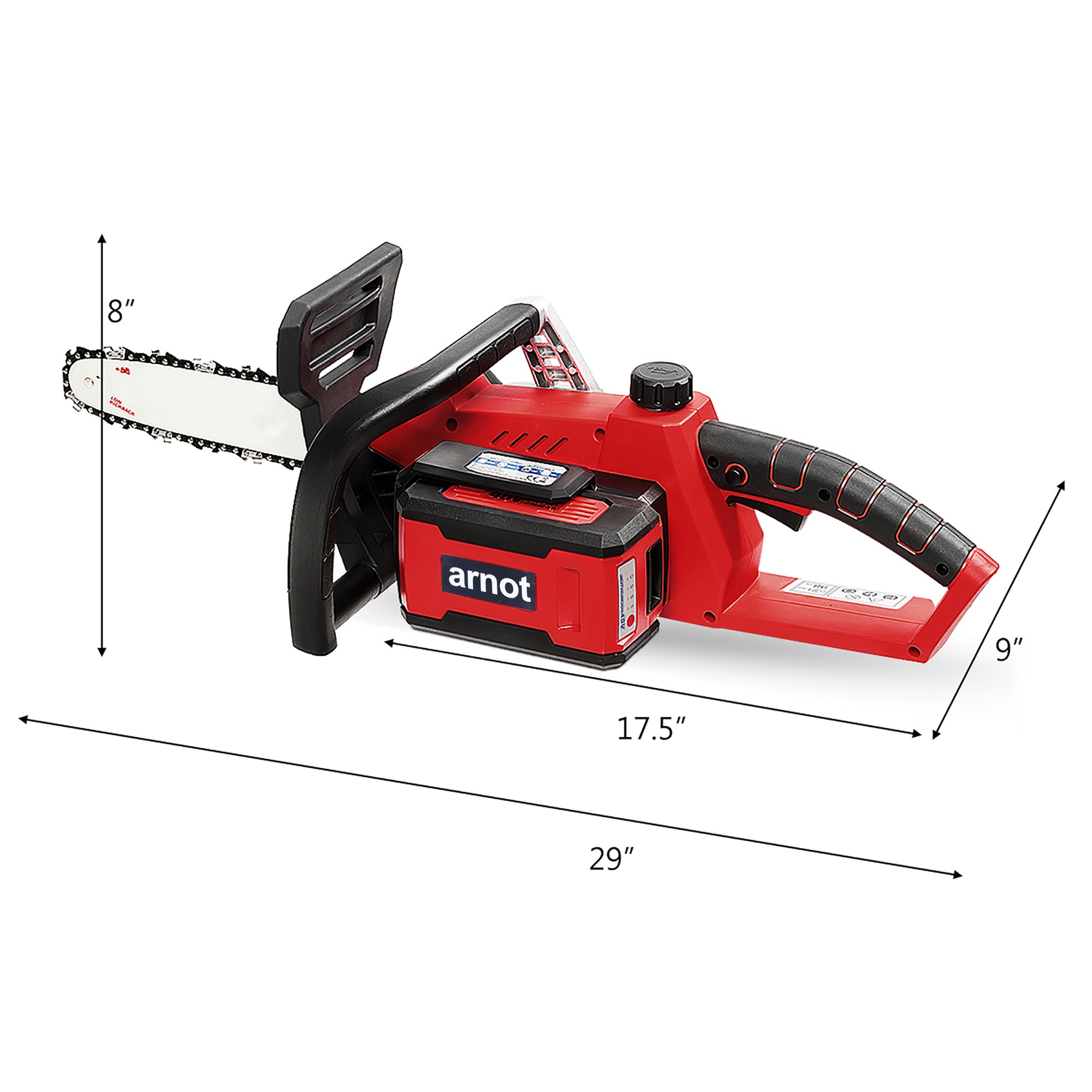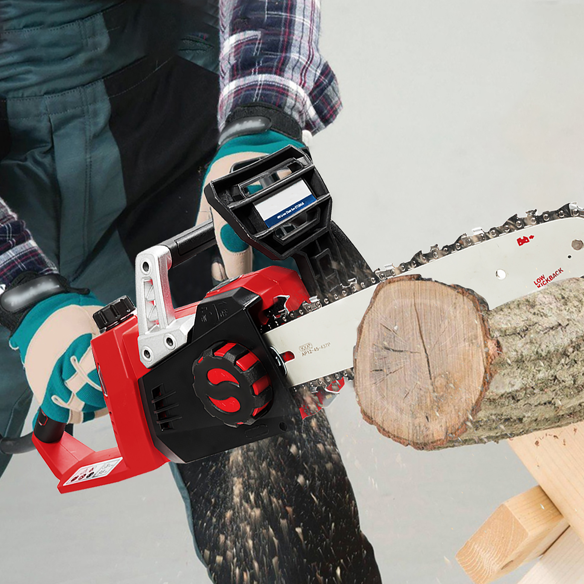 Pure-copper motor with rotation speed of 4500prm provides steady and reliable power in wood cutting. Cordless design makes it easy to work outdoors. 4.0Ah large-capacity battery and fast charger help you extend working time. And the ergonomic front handle combined with reinforced baffle excellently prevents splashing of dust and wood chips while ensuring personal safety. What's more, tool-free chain tensioning is designed for adjusting chain easily. It is ideal for farmer, woodcutters and others who cut regularly.