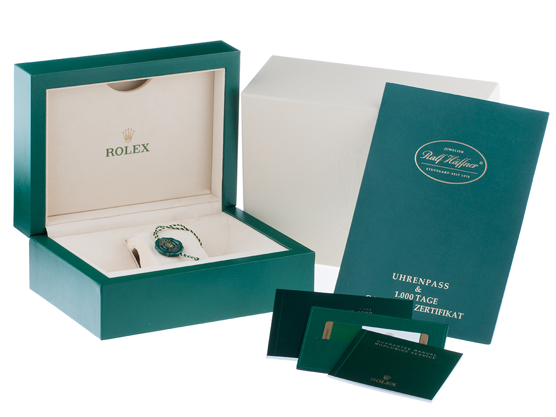 LieferumfangOriginal Rolex Box mit Umkarton und Garantie Papiere von 10/2015 sowie Beschreibung, Ledermäppchen und Rolex Chronometer-Siegel, LC 320 / Tschechien EU, einer der letzten mit alter Rolex "White Card" Garantie Karte, Full Set