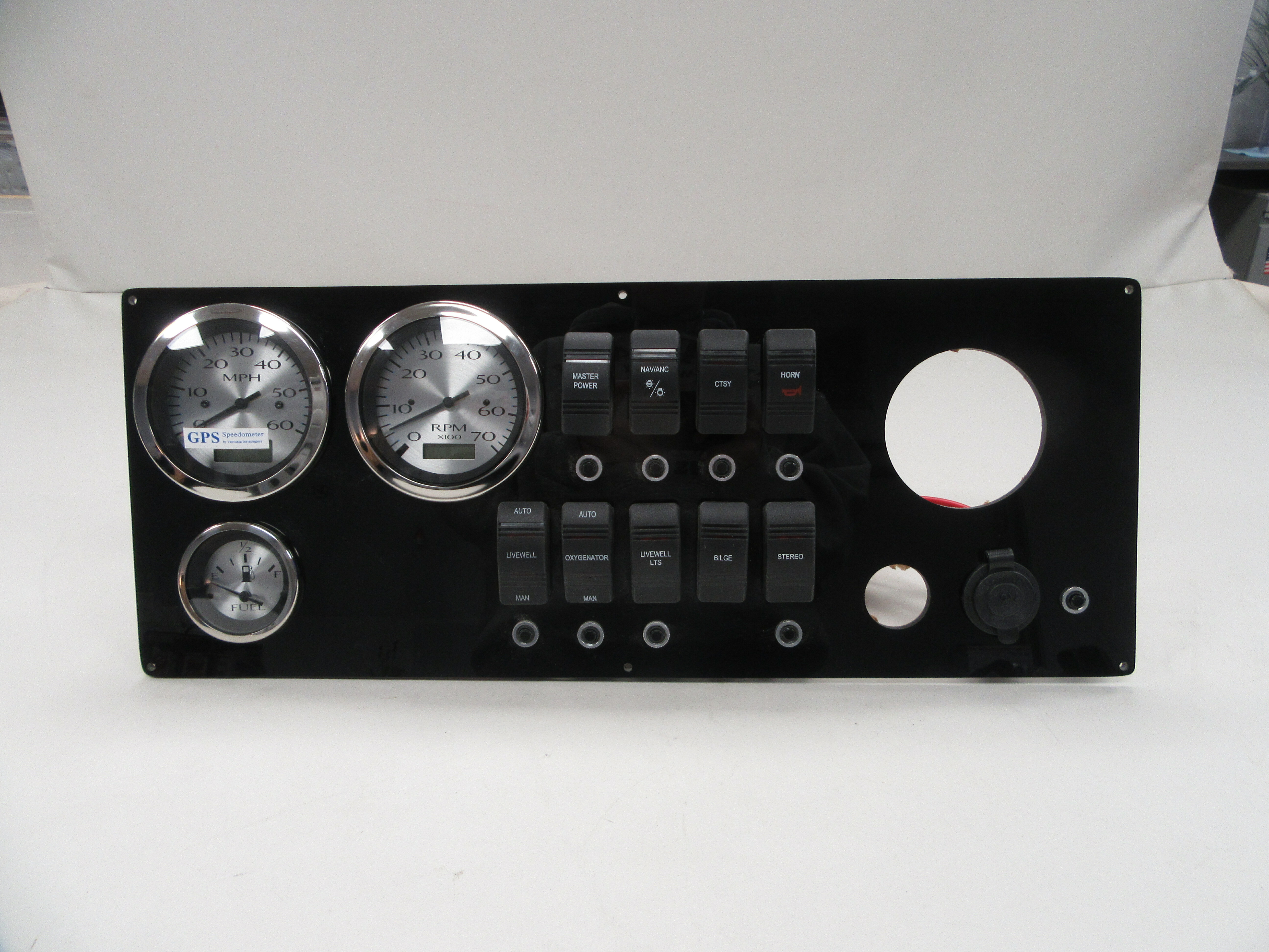 I am selling a Larson gauge / switch dash panel, part # 73383. This item is new, not in original packaging and comes as shown. The gauge / switch dash panel is black, with (1) speedometer with digital / part # 781430PDFB, (1) tachometer with digital / part # 781431PDFB, (1) fuel gauge (1) master power switch, (1) NAV/ANC switch, (1) CTSY switch, (1) horn switch, (1) livewell switch, (1) oxygenator switch, (1) livewell LTS switch, (1) bilge switch, (1) stereo switch, (1) 12V outlet, (9) small breakers and roughly measures 19 1/4" L x 7 1/2" W of the panel overall. (OB / 67 D / 9101387) / LH Shipping cost is for the continental United States only (lower 48 States). For shipping outside this area, please inquire about shipping costs before purchase.