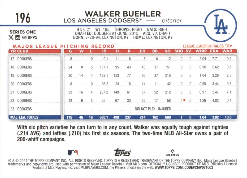 | 2024 Topps Series 1 Walker Buehler Los Angeles Dodgers #196 Baseball Card |