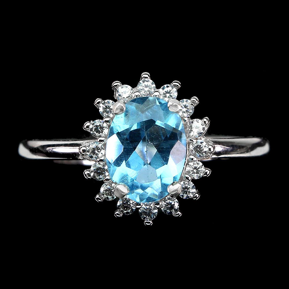 Oval Swiss Blue Topaz 8x6mm Cz 14K White Gold Plate 925 Sterling Silver Ring 8