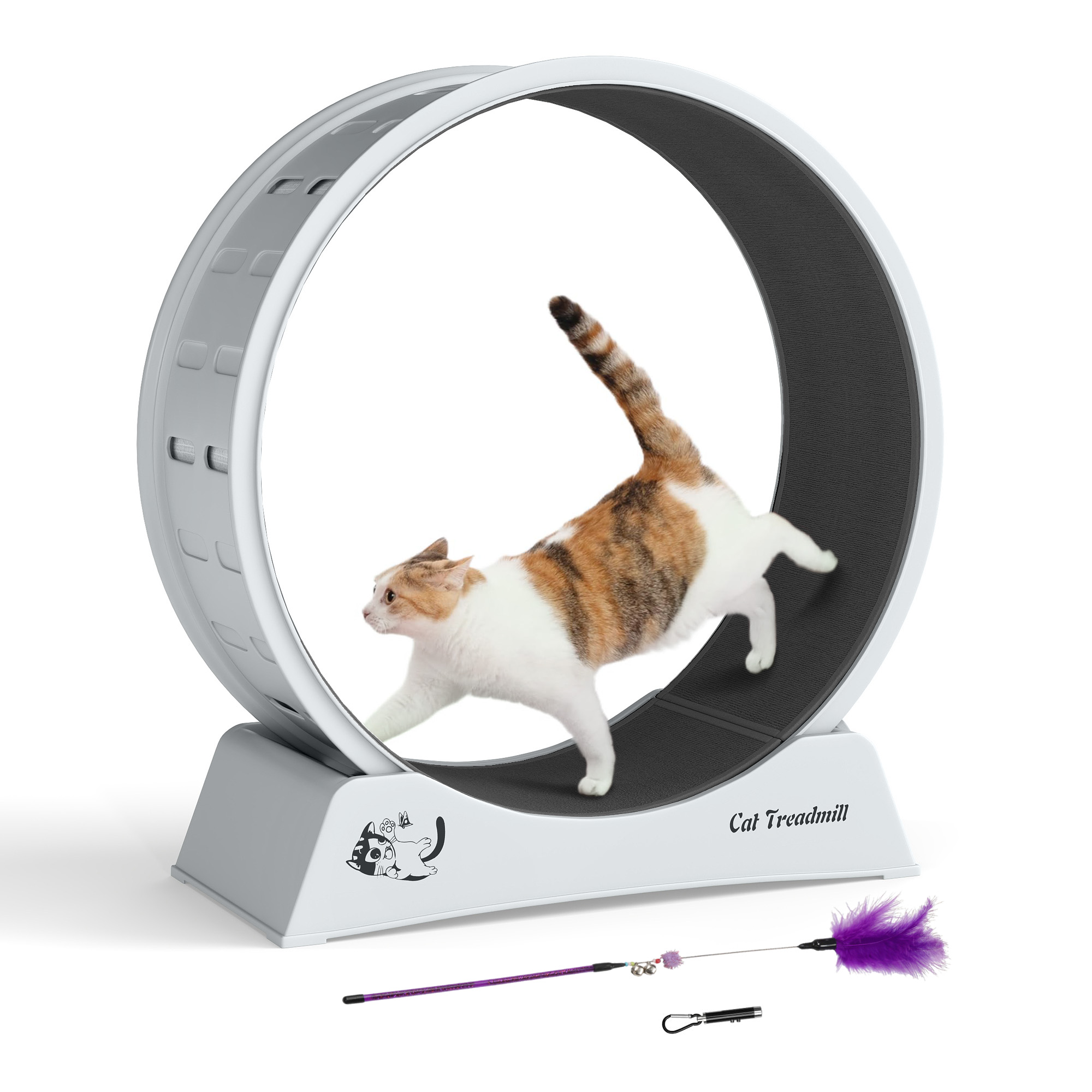 【Easy Assembly with Manual】: With snap-on installation, the cat treadmill is super easy to set up without any tools. A cat teaser is added for you to train your furry friend to use this exercise wheel easily. Overall size: 31.5"L x 13.2"W x 33.86"H.