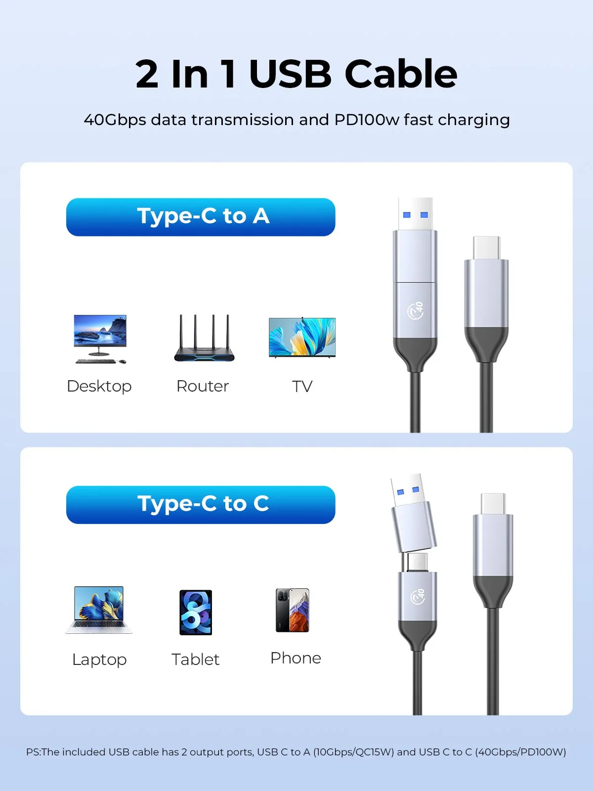 40Gbps data transmission and PD100w fast charging.NOTE:The included USB cable has 2 output ports, USB C to A (10Gbps/QC15W) and USB C to C (40Gbps/PD100W)