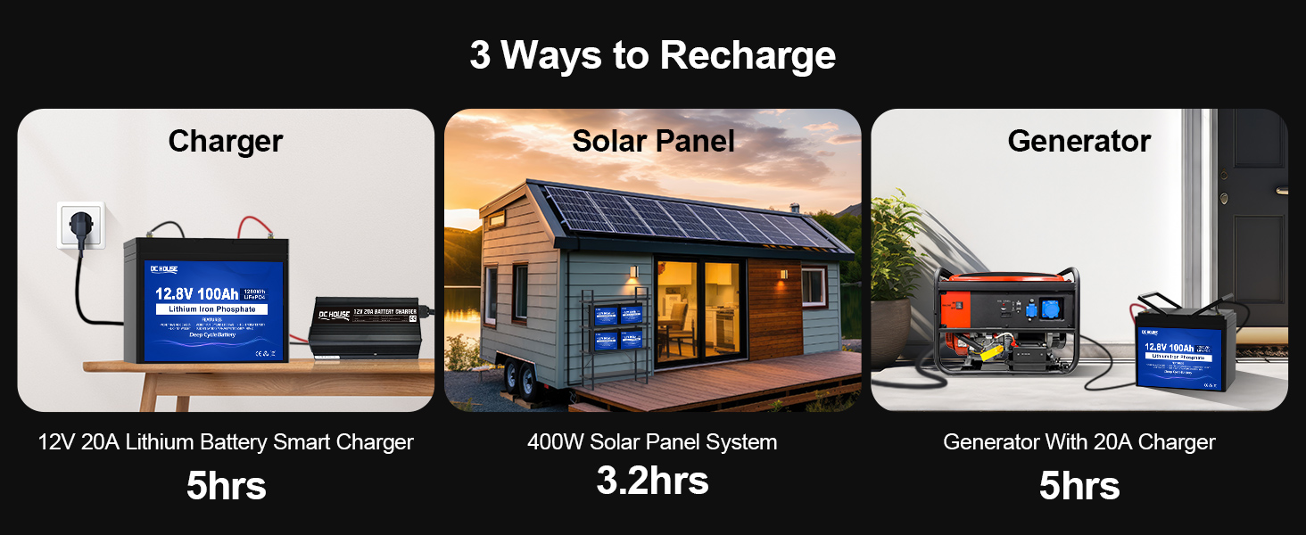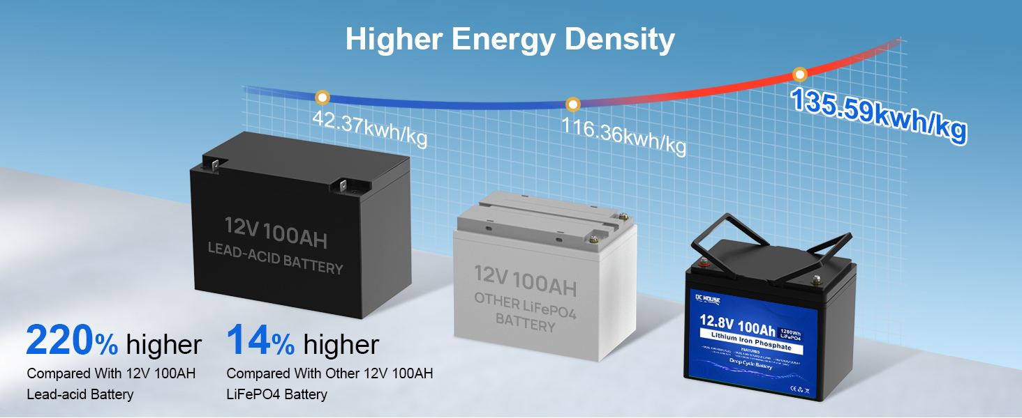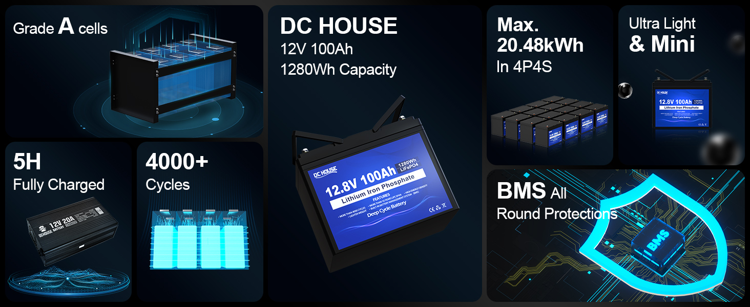 DC HOUSE lithium iron phosphate battery can provide 1280Wh full energy output, only a third of the weight of lead-acid batteries, easy to move and install, energy density of 57Wh/Lb, is the perfect replacement for SLA/AGM batteries, our battery life is up to 10 years, life cycle up to more than 15,000 times.