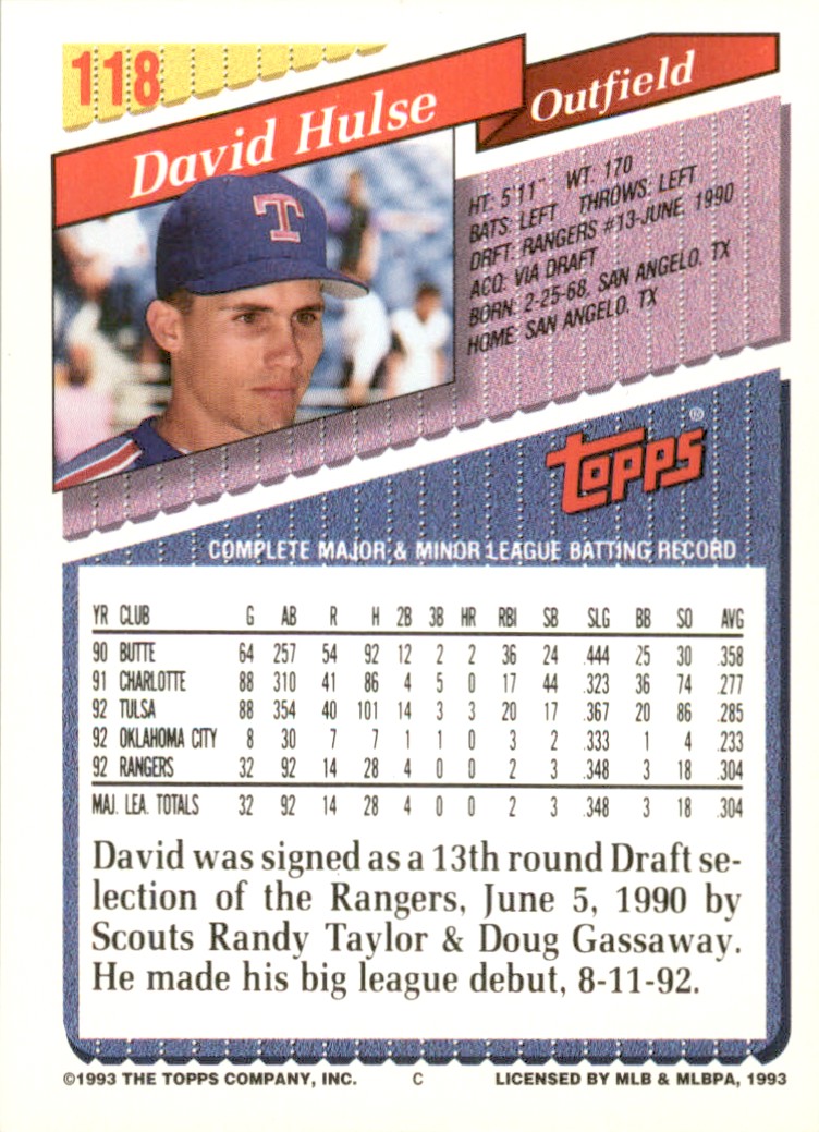 | 1993 Topps Gold David Hulse Texas Rangers #118 Baseball Card |