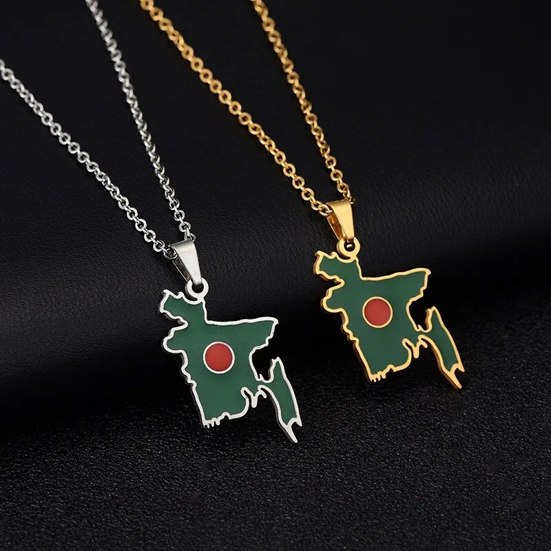 This necklace features a pendant in the shape of the map of Bangladesh, adorned with the national flag design. The necklace is made of stainless steel with a gold-plated finish, giving it a luxurious look. It is a stylish piece of jewellery that showcases the theme of flags and political symbols, making it a perfect gift for someone who has a connection to or appreciates Bangladesh. The chain design adds to its elegance, making it suitable for everyday wear or special occasions.