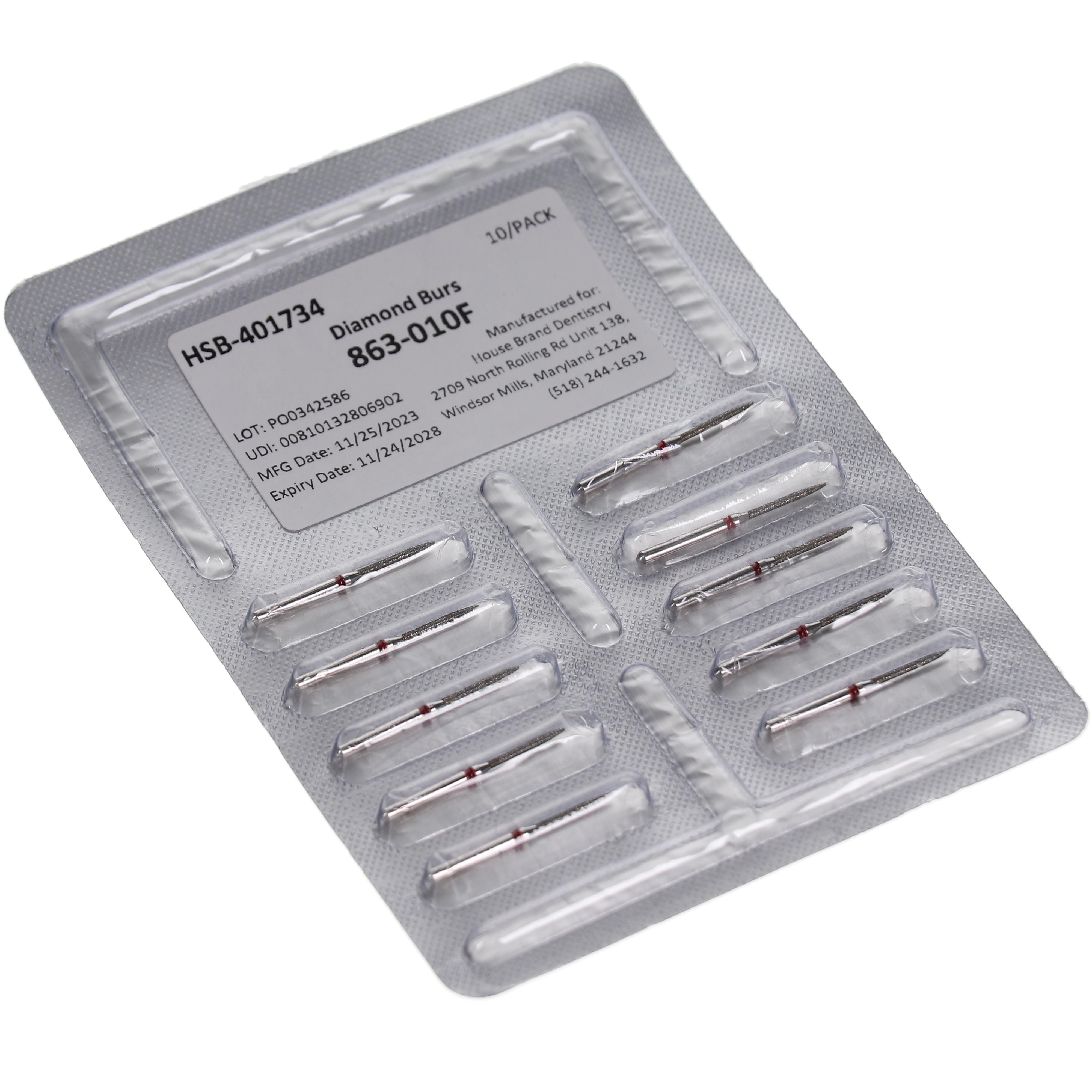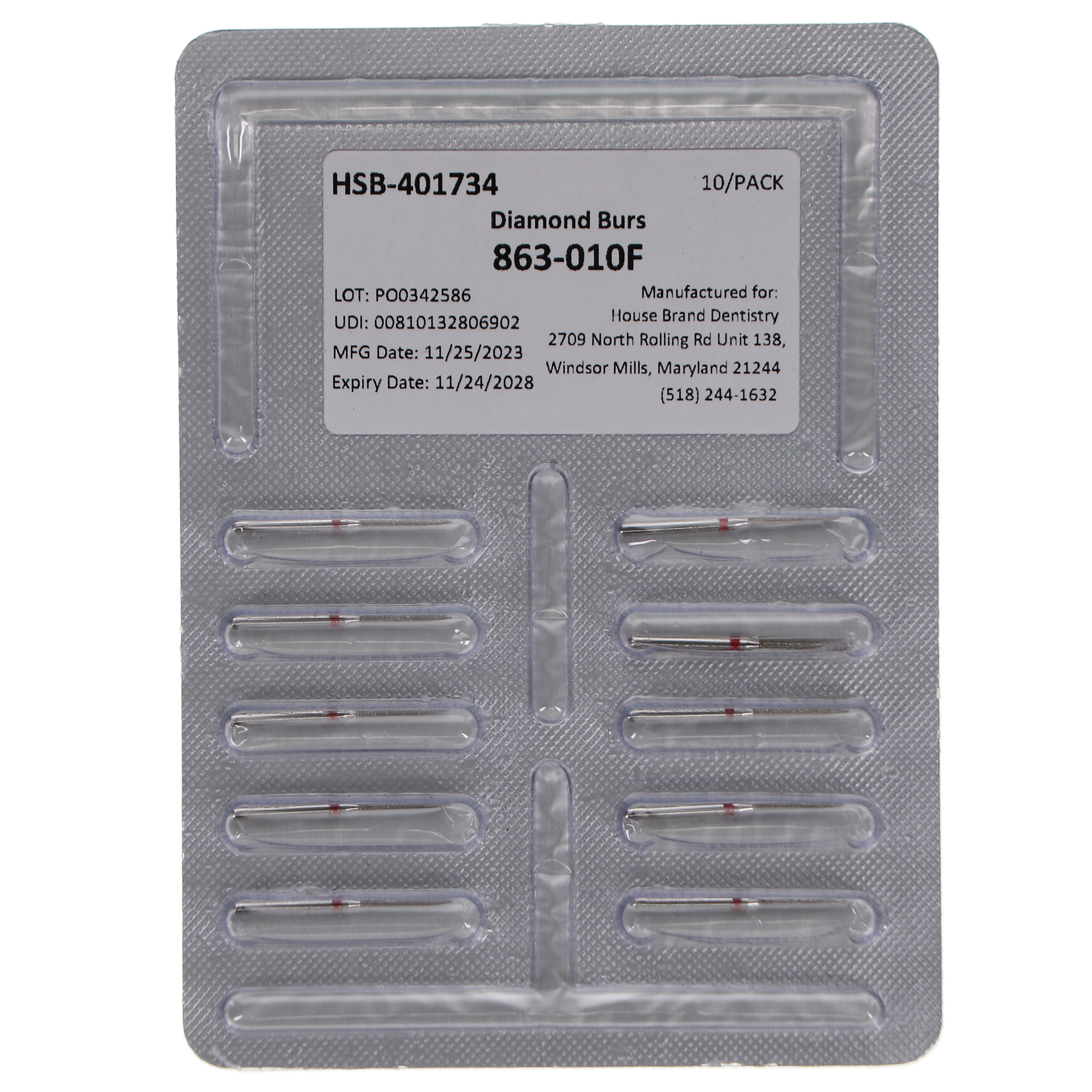 FG #863.010 Fine grit, Flame diamond burs, 10/Pk.