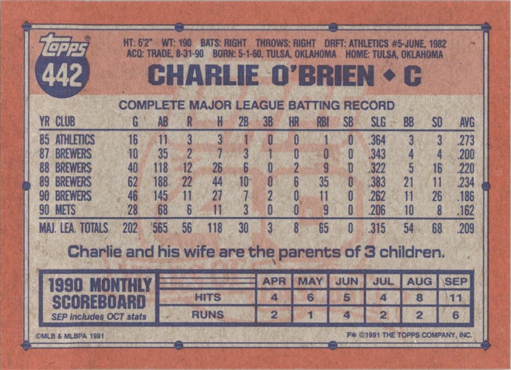 | 1991 Topps Charlie O'Brien (1) New York Mets #442 Baseball Card |